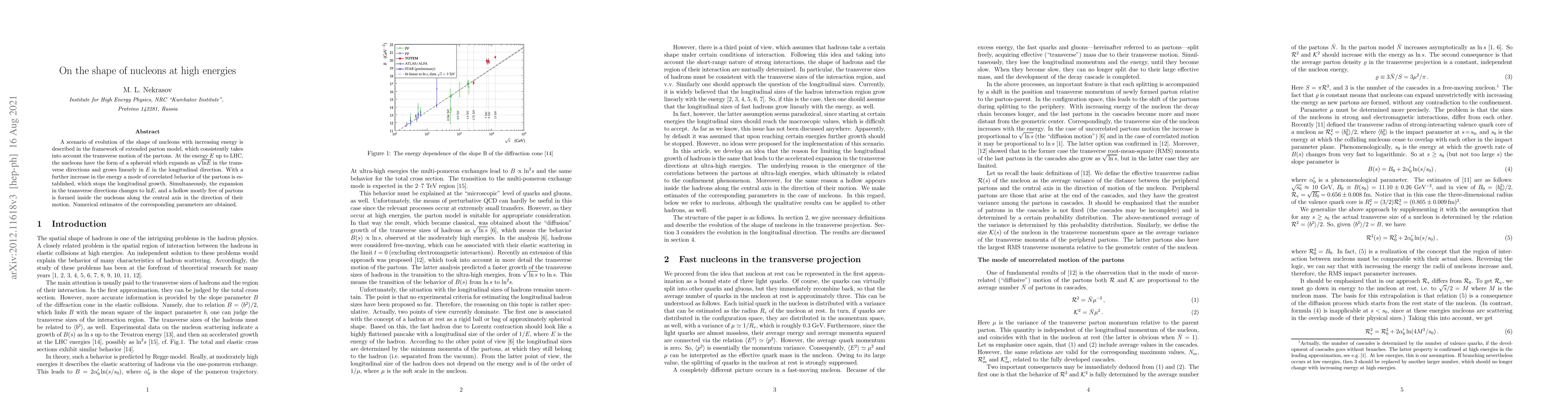 A scenario of evolution of the shape of nucleons with increasing energy is described in the framework of extended parton model, which consistently takes into account the transverse motion of the partons. At the energy $E$ up to LHC, the nucleons have the form of a spheroid which expands as $\sqrt{\ln \!E}$ in the transverse directions and grows linearly in $E$ in the longitudinal direction. With a further increase in the energy a mode of correlated behavior of the partons is established, which stops the longitudinal growth. Simultaneously, the expansion in the transverse directions changes to $\ln \!E$, and a hollow mostly free of partons is formed inside the nucleons along the central axis in the direction of their motion. Numerical estimates of the corresponding parameters are obtained.