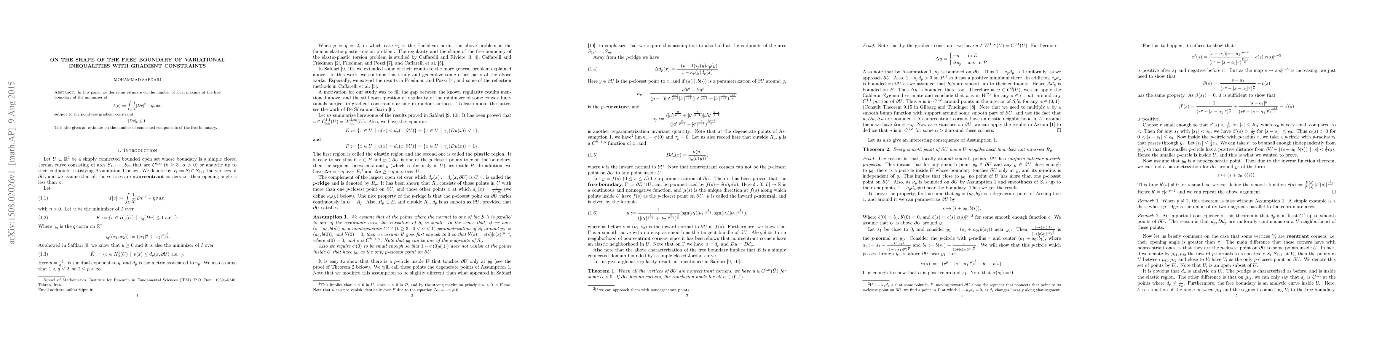 This paper provides an estimate on the number of local maxima and connected components of the free boundary for variational inequalities with gradient constraints, contributing to the understanding of the shape of such boundaries.
