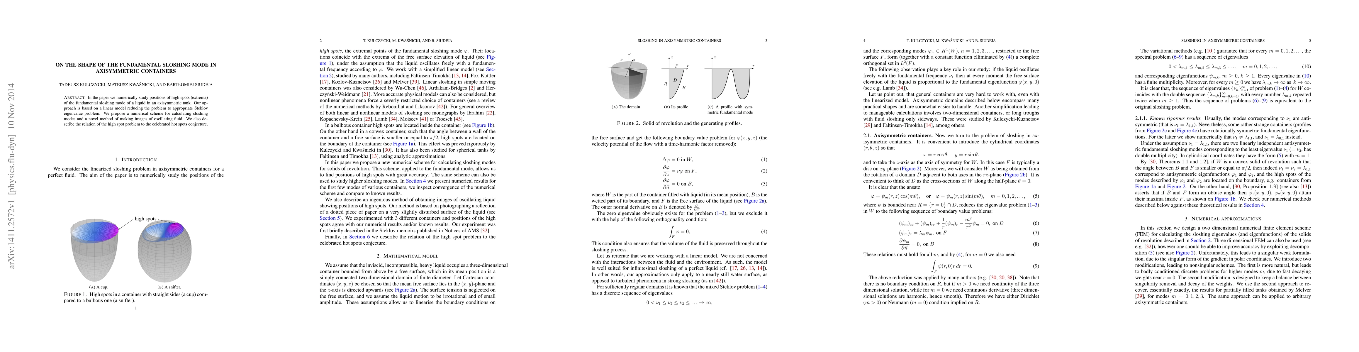 This paper numerically investigates the positions of high spots in the fundamental sloshing mode of liquid in an axisymmetric tank using a linear model and a Steklov eigenvalue problem. It introduces a new numerical scheme and method for visualizing oscillating fluid, and relates the high spot problem to the hot spots conjecture.