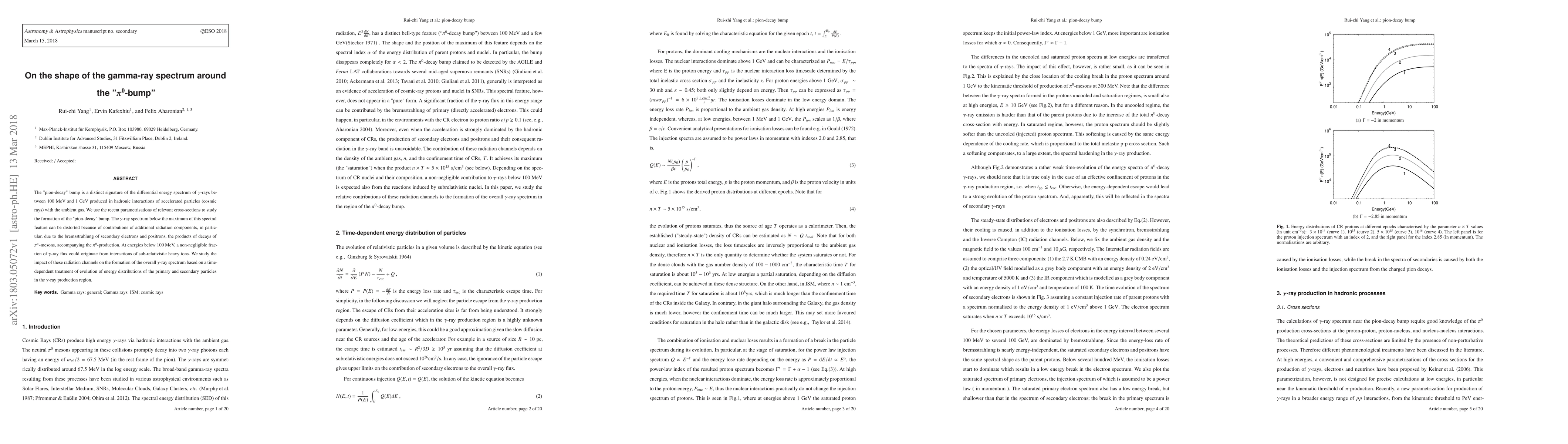 The "pion-decay" bump is a distinct signature of the differential energy spectrum of $\gamma$-rays between 100 MeV and 1 GeV produced in hadronic interactions of accelerated particles (cosmic rays) with the ambient gas. We use the recent parametrisations of relevant cross-sections to study the formation of the "pion-decay" bump. The $\gamma$-ray spectrum below the maximum of this spectral feature can be distorted because of contributions of additional radiation components, in particular, due to the bremsstrahlung of secondary electrons and positrons, the products of decays of $\pi^\pm$-mesons, accompanying the $\pi^0$-production. At energies below 100 MeV, a non-negligible fraction of $\gamma$-ray flux could originate from interactions of sub-relativistic heavy ions. We study the impact of these radiation channels on the formation of the overall $\gamma$-ray spectrum based on a time-dependent treatment of evolution of energy distributions of the primary and secondary particles in the $\gamma$-ray production region.