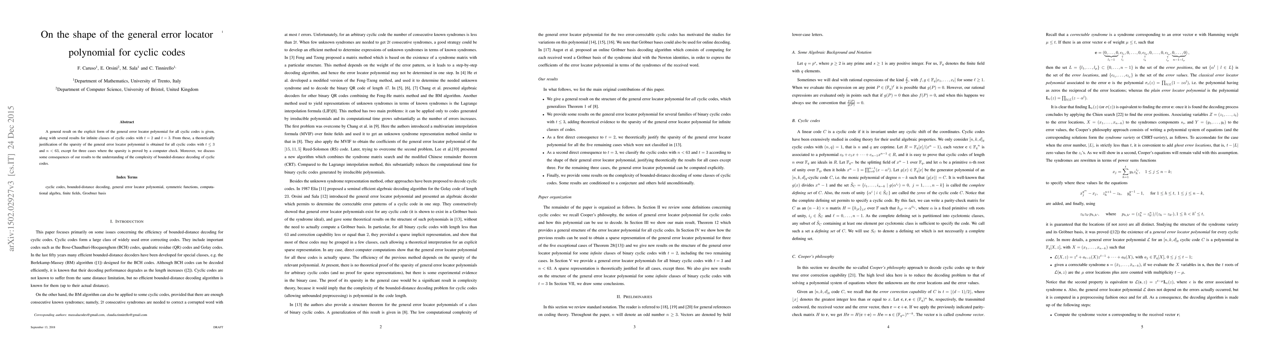 A general result on the explicit form of the general error locator polynomial for all cyclic codes is given, along with several results for infinite classes of cyclic codes with $t=2$ and $t=3$. From these, a theoretically justification of the sparsity of the general error locator polynomial is obtained for all cyclic codes with $t\leq 3$ and $n<63$, except for three cases where the sparsity is proved by a computer check. Moreover, we discuss some consequences of our results to the understanding of the complexity of bounded-distance decoding of cyclic codes.