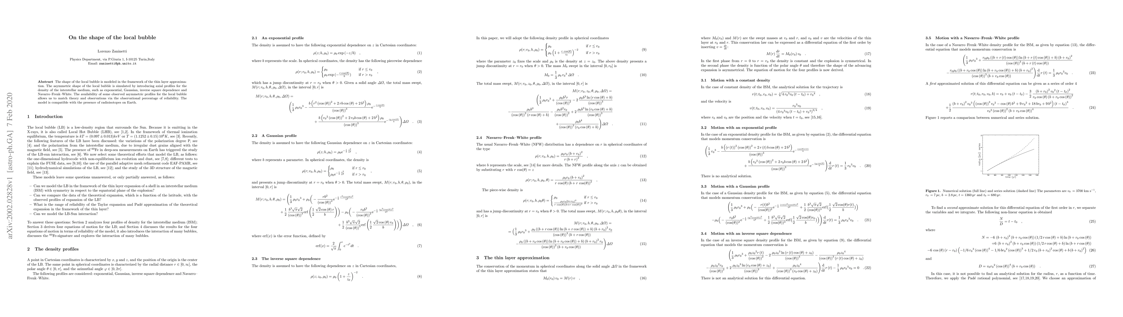 The shape of the local bubble is modeled in the framework of the thin layer approximation. The asymmetric shape of the local bubble is simulated by introducing axial profiles for the density of the interstellar medium, such as exponential, Gaussian, inverse square dependence and Navarro--Frenk--White. The availability of some observed asymmetric profiles for the local bubble allows us to match theory and observations via the observational percentage of reliability. The model is compatible with the presence of radioisotopes on Earth.