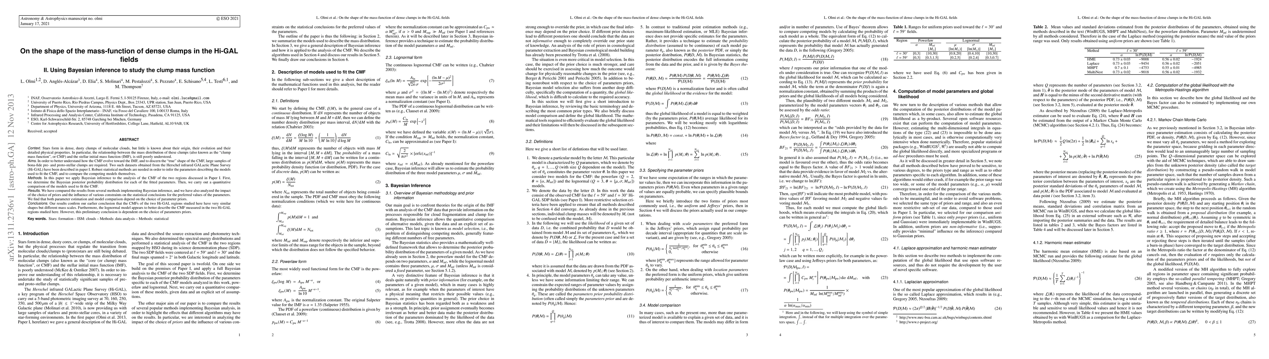 Context. Stars form in dense, dusty clumps of molecular clouds, but little is known about their origin, their evolution and their detailed physical properties. In particular, the relationship between the mass distribution of these clumps (also known as the "clump mass function", or CMF) and the stellar initial mass function (IMF), is still poorly understood. Aims. In order to better understand how the CMF evolve toward the IMF, and to discern the "true" shape of the CMF, large samples of bona-fide pre- and proto-stellar clumps are required. Two such datasets obtained from the Herschel infrared GALactic Plane Survey (Hi-GAL) have been described in paper I. Robust statistical methods are needed in order to infer the parameters describing the models used to fit the CMF, and to compare the competing models themselves. Methods. In this paper we apply Bayesian inference to the analysis of the CMF of the two regions discussed in Paper I. First, we determine the Bayesian posterior probability distribution for each of the fitted parameters. Then, we carry out a quantitative comparison of the models used to fit the CMF. Results. We have compared the results from several methods implementing Bayesian inference, and we have also analyzed the impact of the choice of priors and the influence of various constraints on the statistical conclusions for the preferred values of the parameters. We find that both parameter estimation and model comparison depend on the choice of parameter priors. Conclusions. Our results confirm our earlier conclusion that the CMFs of the two Hi-GAL regions studied here have very similar shapes but different mass scales. Furthermore, the lognormal model appears to better describe the CMF measured in the two Hi-GAL regions studied here. However, this preliminary conclusion is dependent on the choice of parameters priors.
