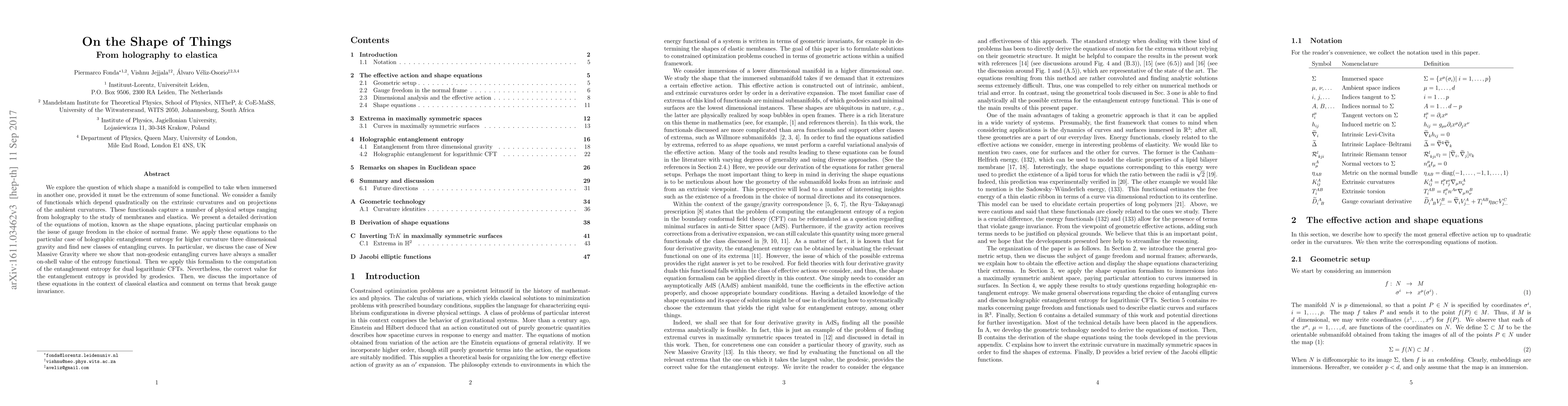 We explore the question of which shape a manifold is compelled to take when immersed in another one, provided it must be the extremum of some functional. We consider a family of functionals which depend quadratically on the extrinsic curvatures and on projections of the ambient curvatures. These functionals capture a number of physical setups ranging from holography to the study of membranes and elastica. We present a detailed derivation of the equations of motion, known as the shape equations, placing particular emphasis on the issue of gauge freedom in the choice of normal frame. We apply these equations to the particular case of holographic entanglement entropy for higher curvature three dimensional gravity and find new classes of entangling curves. In particular, we discuss the case of New Massive Gravity where we show that non-geodesic entangling curves have always a smaller on-shell value of the entropy functional. Then we apply this formalism to the computation of the entanglement entropy for dual logarithmic CFTs. Nevertheless, the correct value for the entanglement entropy is provided by geodesics. Then, we discuss the importance of these equations in the context of classical elastica and comment on terms that break gauge invariance.
