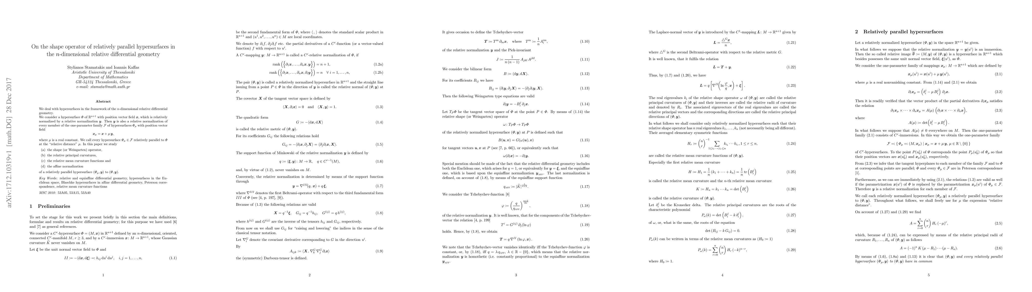 We deal with hypersurfaces in the framework of the $n$-dimensional relative differential geometry. We consider a hypersurface $\varPhi$ of $\mathbb{R}^{n+1}$ with position vector field $\mathbf{x}$, which is relatively normalized by a relative normalization $\mathbf{y}$. Then $\mathbf{y}$ is also a relative normalization of every member of the one-parameter family $\mathcal{F}$ of hypersurfaces $\varPhi_\mu$ with position vector field $$\mathbf{x}_\mu = \mathbf{x} + \mu \, \mathbf{y},$$ where $\mu$ is a real constant. We call every hypersurface $\varPhi_\mu \in \mathcal{F}$ relatively parallel to $\varPhi$ at the "relative distance" $\mu$. In this paper we study (a) the shape (or Weingarten) operator, (b) the relative principal curvatures, (c) the relative mean curvature functions and (d) the affine normalization of a relatively parallel hypersurface $\left( \varPhi_\mu,\mathbf{y}\right)$ to $\left(\varPhi,\mathbf{y}\right)$.