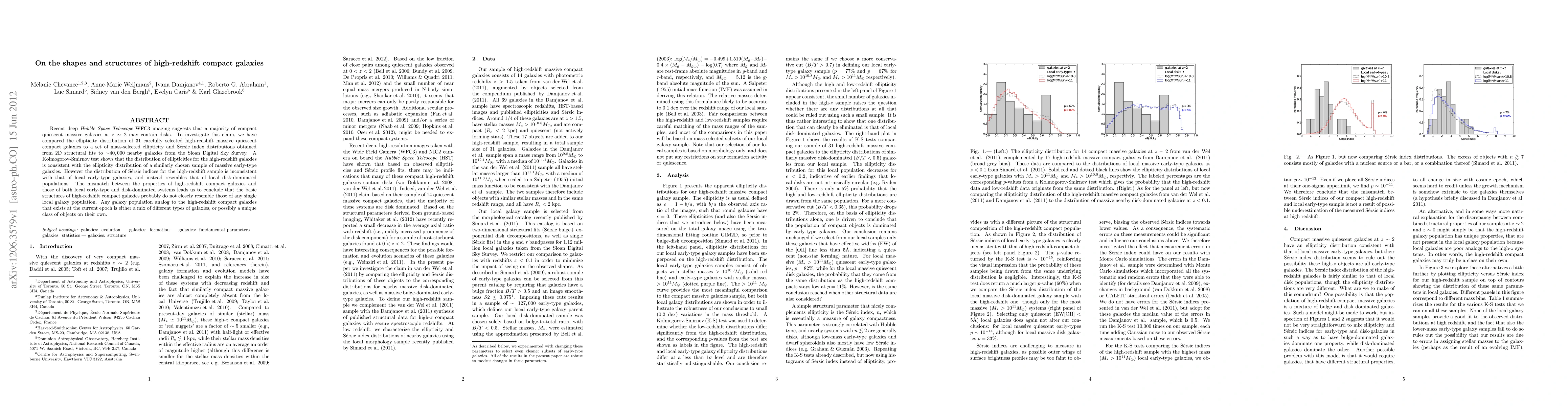 This study finds that high-redshift compact massive quiescent galaxies exhibit disk-like Sersic indices similar to local disk-dominated galaxies, despite their ellipticities resembling those of local early-type galaxies. This suggests high-redshift compact galaxies do not closely match any single local galaxy type.