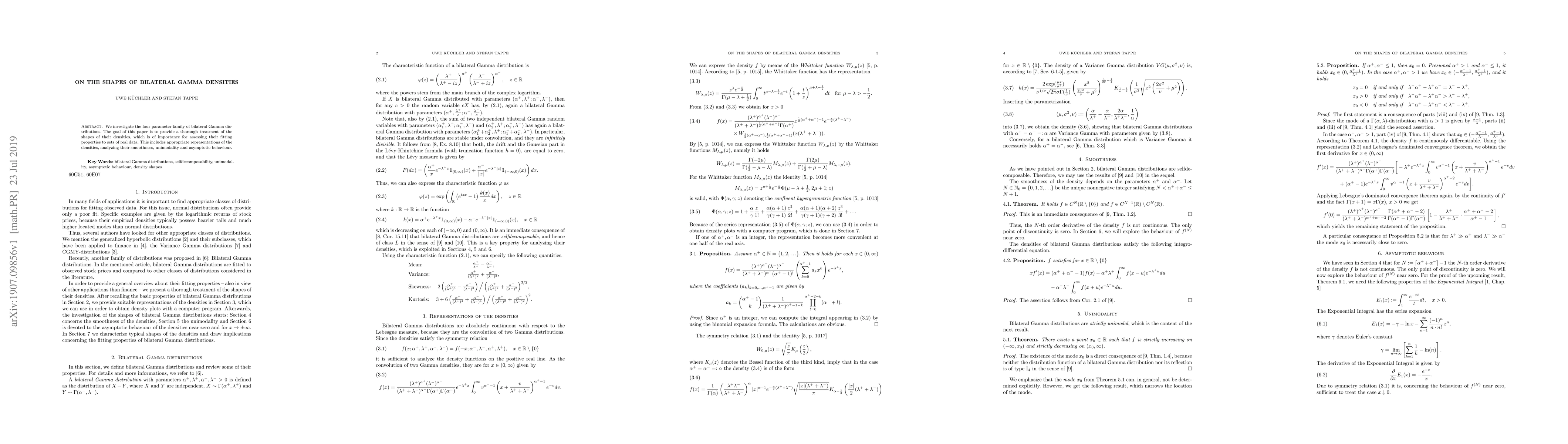 This paper examines the four-parameter bilateral Gamma distributions, detailing their density shapes for better data fitting. It covers density representations, smoothness, unimodality, and asymptotic behavior.