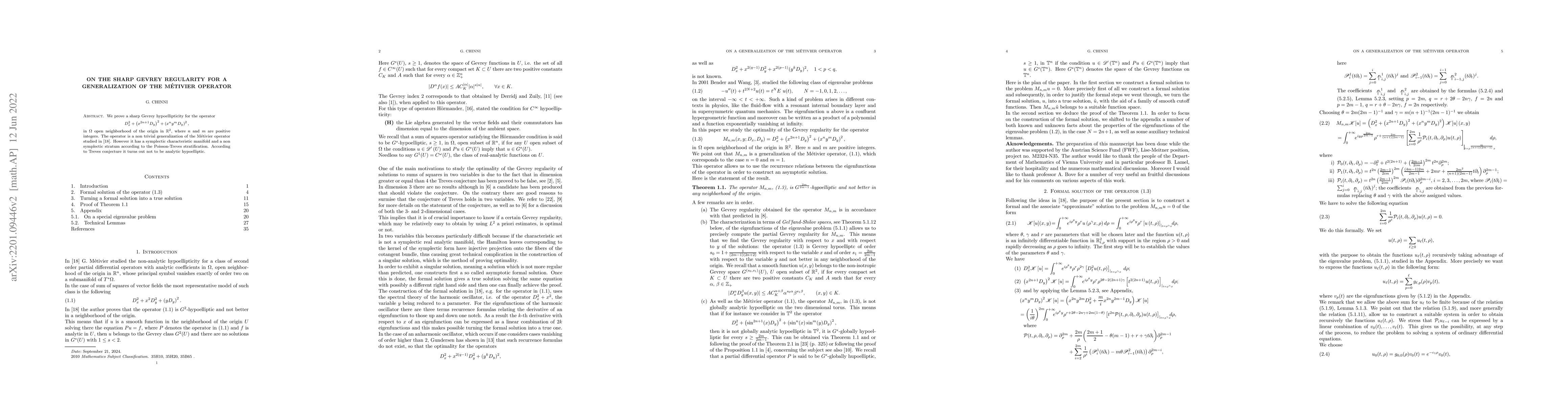 The sharp Gevrey hypoellipticity is provided for the following generalization of the M\'etivier operator, "Non-hypoellipticit\'e analytique pour $D_{x}^{2}+\left( x^{2} + y^{2}\right)D_{y}^{2}$" by G. M\'etivier, \begin{align*} D_{x}^{2}+\left(x^{2n+1}D_{y}\right)^{2}+\left(x^{n}y^{m}D_{y}\right)^{2}, \end{align*} in $\Omega$ open neighborhood of the origin in $\mathbb{R}^{2}$, where $n$ and $m$ are positive integers.