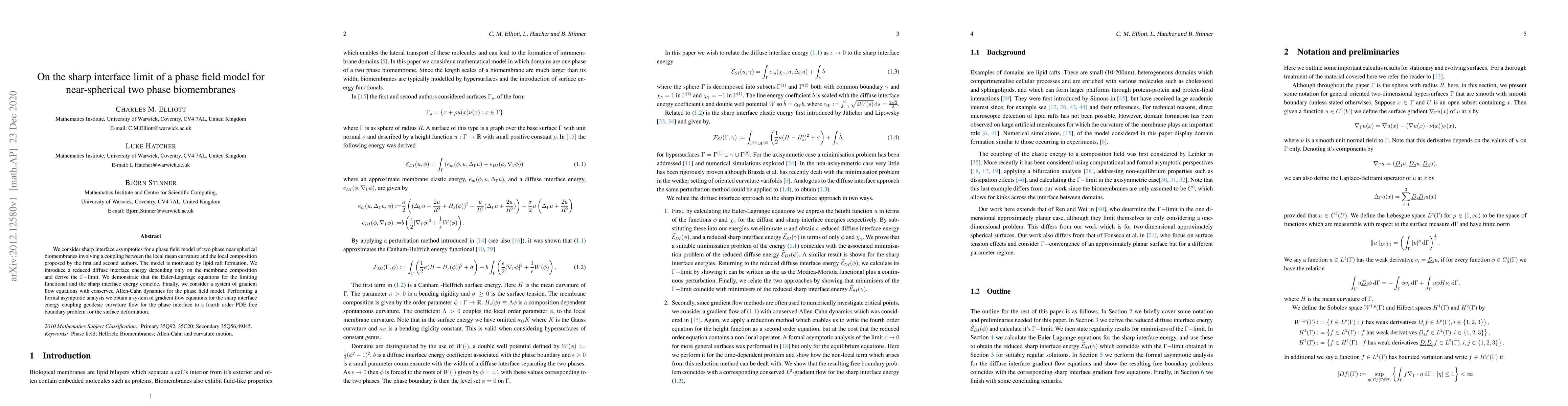 This paper investigates the sharp interface limit of a phase field model for near-spherical two-phase biomembranes, deriving a reduced diffuse interface energy that depends solely on membrane composition. The study demonstrates the equivalence of Euler-Lagrange equations for the limiting functional and the sharp interface energy, and concludes with a system of gradient flow equations for the sharp interface energy, coupling geodesic curvature flow to a fourth-order PDE free boundary problem.