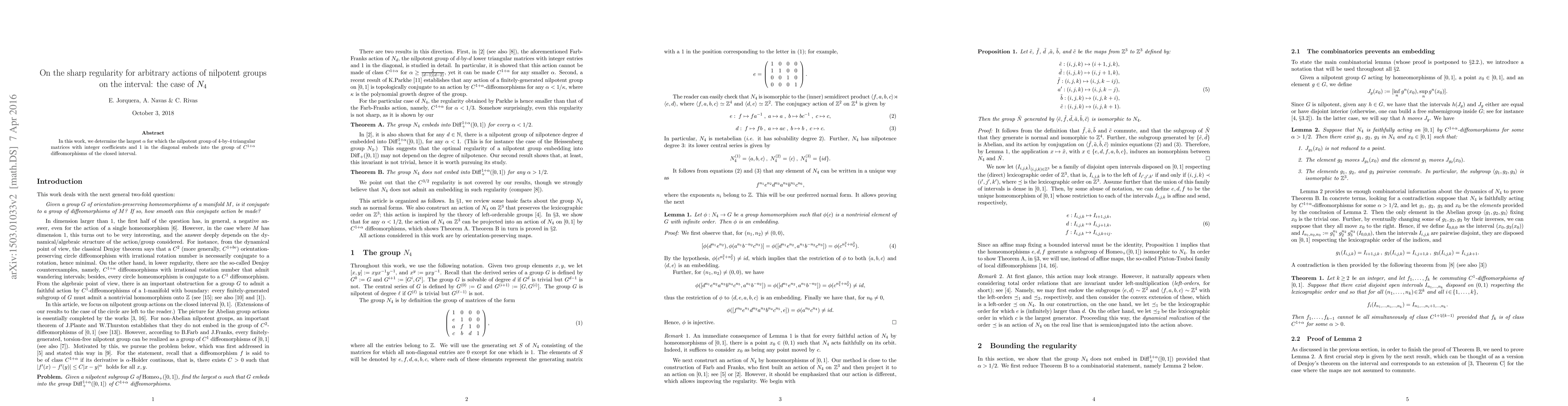 We determine the largest {\alpha} for which the nilpotent group of 4-by-4 triangular matrices with integer coefficients and 1 in the diagonal embeds into the group of C1+{\alpha} diffeomorphism of the closed interval.