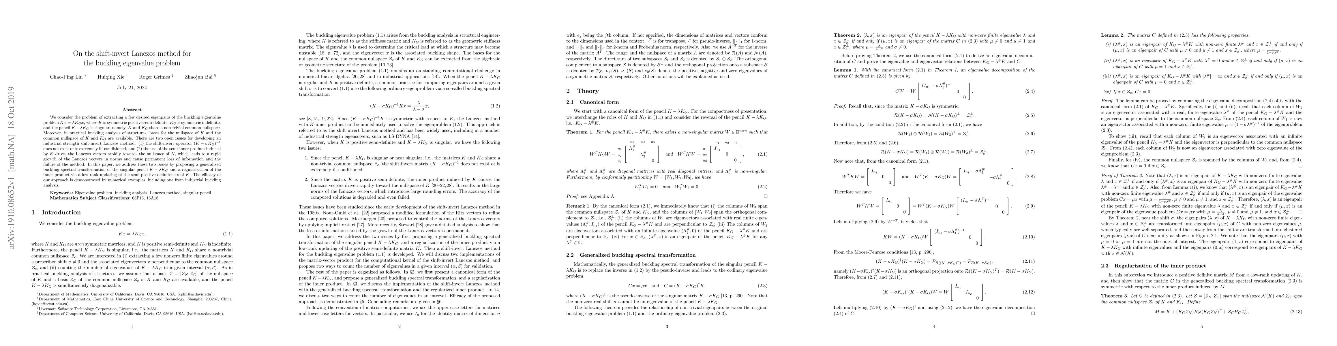 This paper proposes a shift-invert Lanczos method for solving the buckling eigenvalue problem, addressing issues of non-existent or ill-conditioned shift-invert operators and rapid convergence towards nullspaces. It introduces a generalized spectral transformation and inner product regularization, validated by numerical examples from industrial applications.