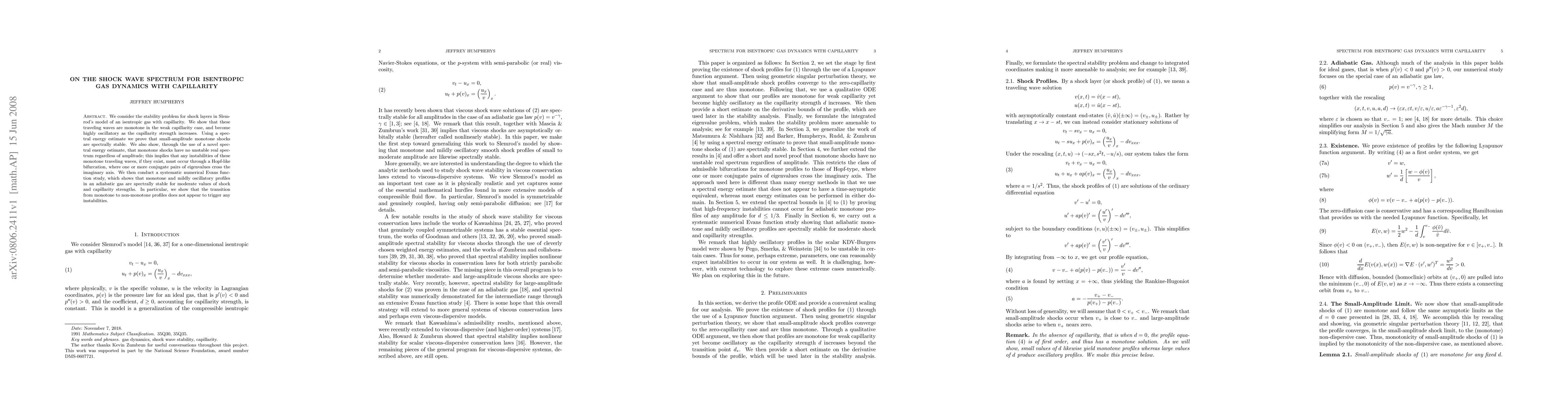 We consider the stability problem for shock layers in Slemrod's model of an isentropic gas with capillarity. We show that these traveling waves are monotone in the weak capillarity case, and become highly oscillatory as the capillarity strength increases. Using a spectral energy estimate we prove that small-amplitude monotone shocks are spectrally stable. We also show, through the use of a novel spectral energy estimate, that monotone shocks have no unstable real spectrum regardless of amplitude; this implies that any instabilities of these monotone traveling waves, if they exist, must occur through a Hopf-like bifurcation, where one or more conjugate pairs of eigenvalues cross the imaginary axis. We then conduct a systematic numerical Evans function study, which shows that monotone and mildly oscillatory profiles in an adiabatic gas are spectrally stable for moderate values of shock and capillarity strengths. In particular, we show that the transition from monotone to non-monotone profiles does not appear to trigger any instabilities.