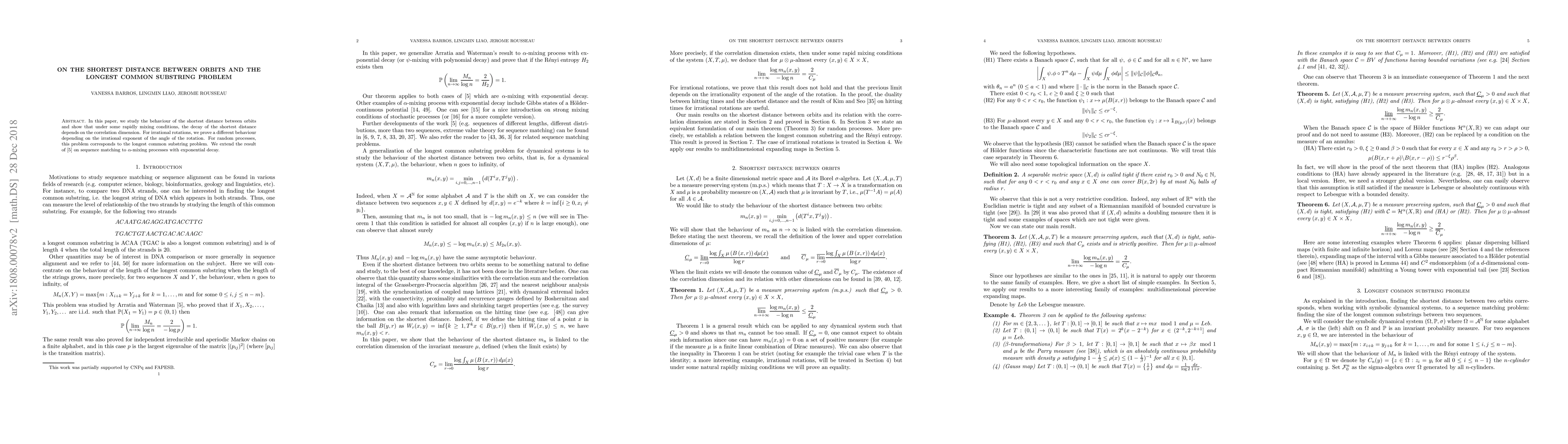 This paper studies the shortest distance between orbits and longest common substring problem, finding that under certain conditions, its decay depends on correlation dimension or irrational rotation's angle exponent.