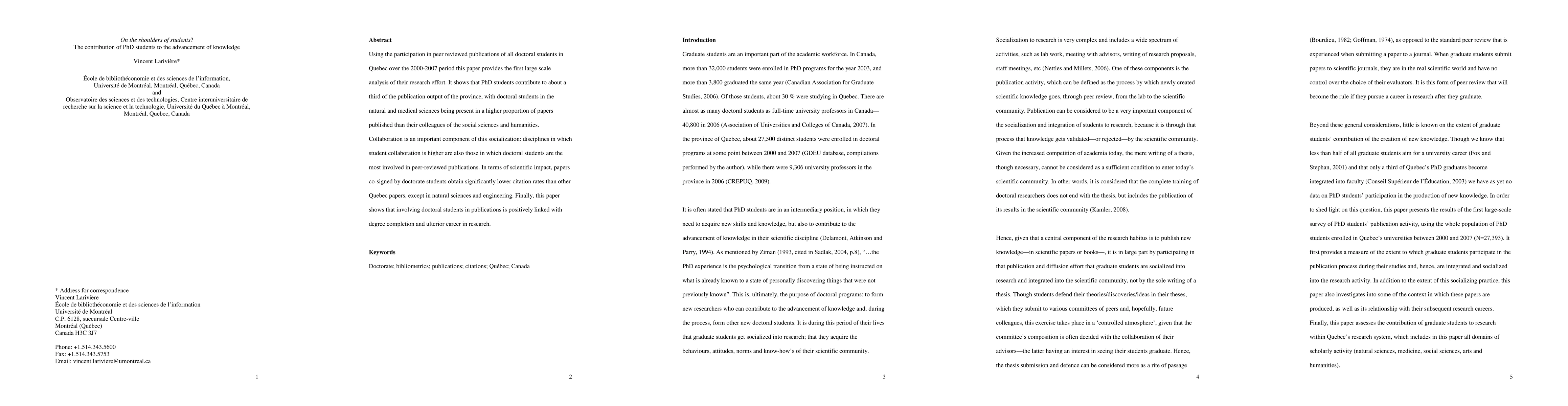 This paper analyzes the contributions of PhD students in Quebec from 2000-2007, revealing they account for about a third of the province's publication output. Doctoral students in natural and medical sciences are more prominently featured in publications compared to social sciences and humanities, with higher collaboration rates correlating to greater student involvement.