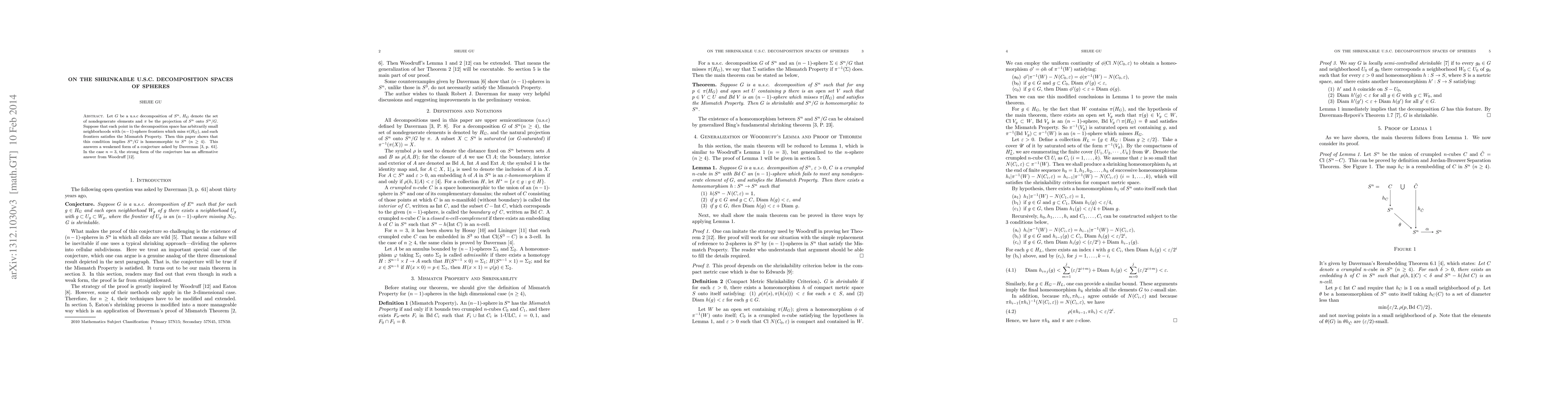 Let $G$ be a u.s.c decomposition of $S^n$, $H_G$ denote the set of nondegenerate elements and $\pi$ be the projection of $S^n$ onto $S^n/G$. Suppose that each point in the decomposition space has arbitrarily small neighborhoods with ($n-1$)-sphere frontiers which miss $\pi(H_G)$, and such frontiers satisfies the Mismatch Property. Then this paper shows that this condition implies $S^n/G$ is homeomorphic to $S^n$ ($n\geq 4$). This answers a weakened form of a conjecture asked by Daverman [3, p. 61]. In the case $n=3$, the strong form of the conjecture has an affirmative answer from Woodruff [12].