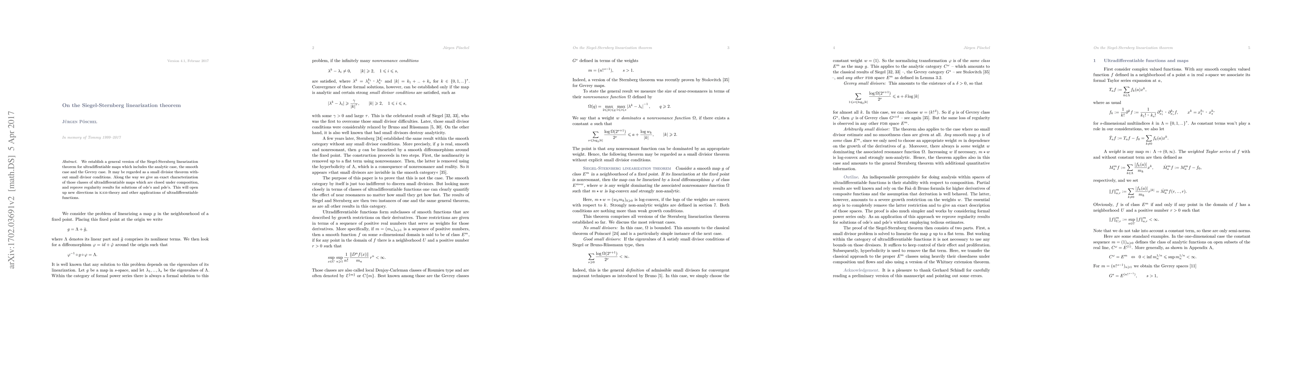 We establish a general version of the Siegel-Sternberg linearization theorem for ultradiffentiable maps which includes the analytic case, the smooth case and the Gevrey case. It may regarded as a small divisior theorem without small divisor conditions. Along the way we give an exact characterization of those classes of ultradifferentiable maps which are closed under composition, and reprove regularity results for solutions of ode's and pde's. This will open up new directions in \textsc{kam}-theory and other applications of ultradifferentiable functions.