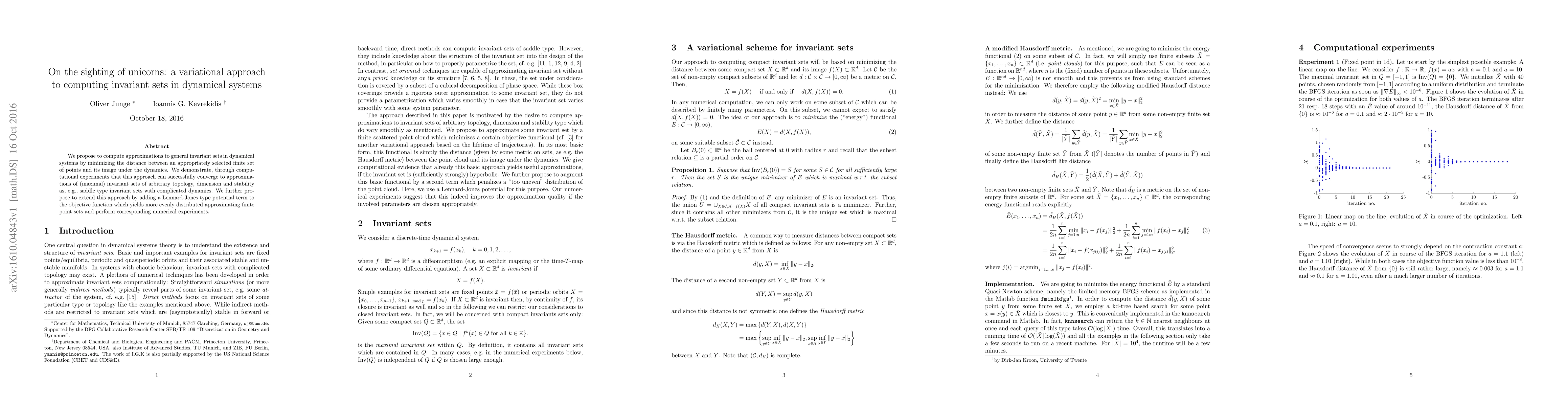 We propose to compute approximations to general invariant sets in dynamical systems by minimizing the distance between an appropriately selected finite set of points and its image under the dynamics. We demonstrate, through computational experiments that this approach can successfully converge to approximations of (maximal) invariant sets of arbitrary topology, dimension and stability as, e.g., saddle type invariant sets with complicated dynamics. We further propose to extend this approach by adding a Lennard-Jones type potential term to the objective function which yields more evenly distributed approximating finite point sets and perform corresponding numerical experiments.