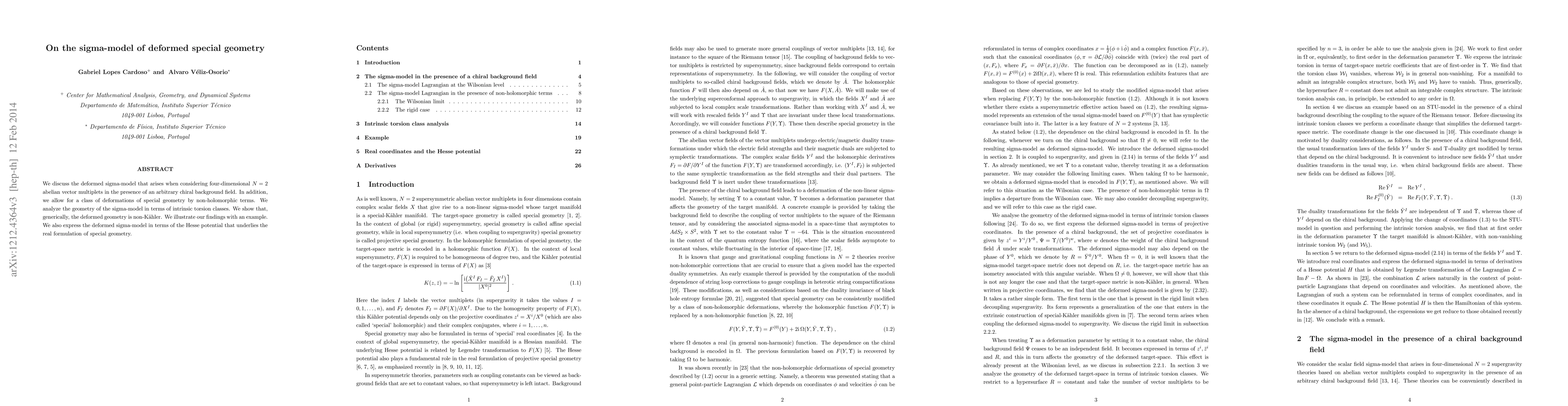 We discuss the deformed sigma-model that arises when considering four-dimensional N=2 abelian vector multiplets in the presence of an arbitrary chiral background field. In addition, we allow for a class of deformations of special geometry by non-holomorphic terms. We analyze the geometry of the sigma-model in terms of intrinsic torsion classes. We show that, generically, the deformed geometry is non-Kahler. We illustrate our findings with an example. We also express the deformed sigma-model in terms of the Hesse potential that underlies the real formulation of special geometry.