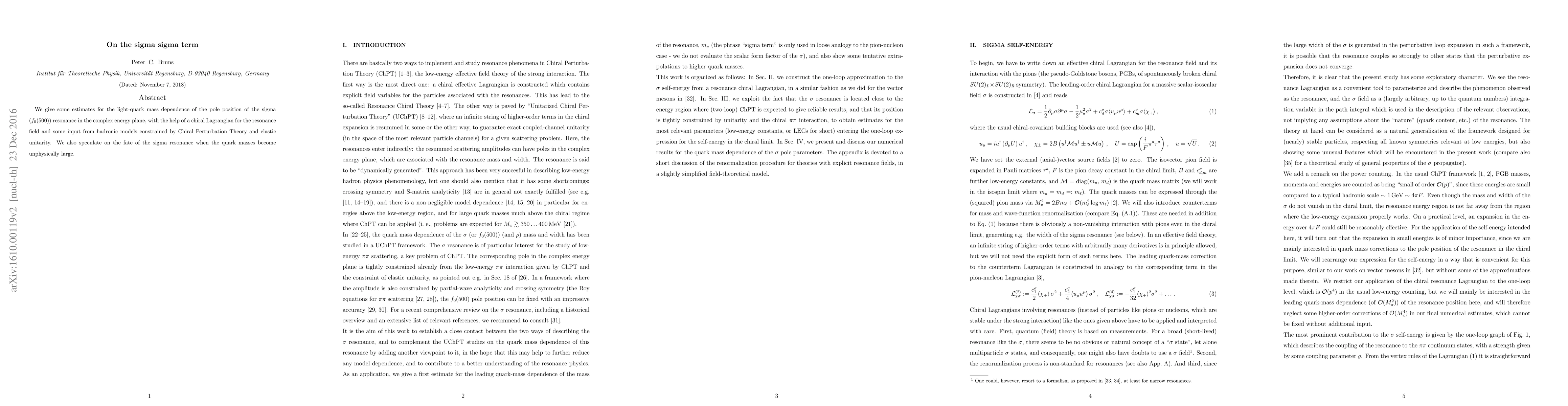 We give some estimates for the light-quark mass dependence of the pole position of the sigma ($f_{0}(500)$) resonance in the complex energy plane, with the help of a chiral Lagrangian for the resonance field and some input from hadronic models constrained by Chiral Perturbation Theory and elastic unitarity. We also speculate on the fate of the sigma resonance when the quark masses become unphysically large.