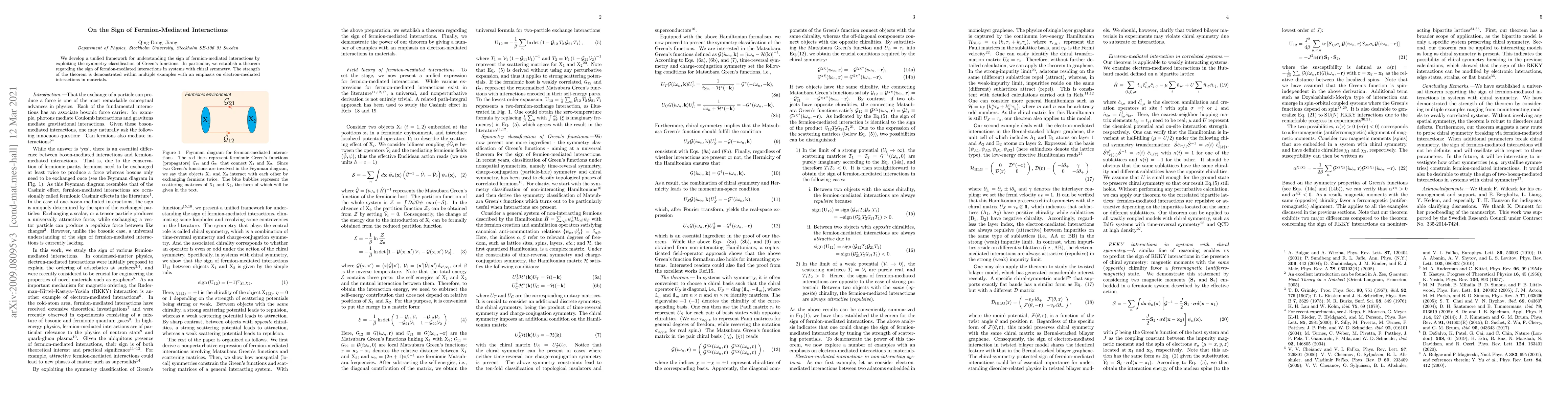 We develop a unified framework for understanding the sign of fermion-mediated interactions by exploiting the symmetry classification of Green's functions. In particular, we establish a theorem regarding the sign of fermion-mediated interactions in systems with chiral symmetry. The strength of the theorem is demonstrated within multiple examples with an emphasis on electron-mediated interactions in materials.