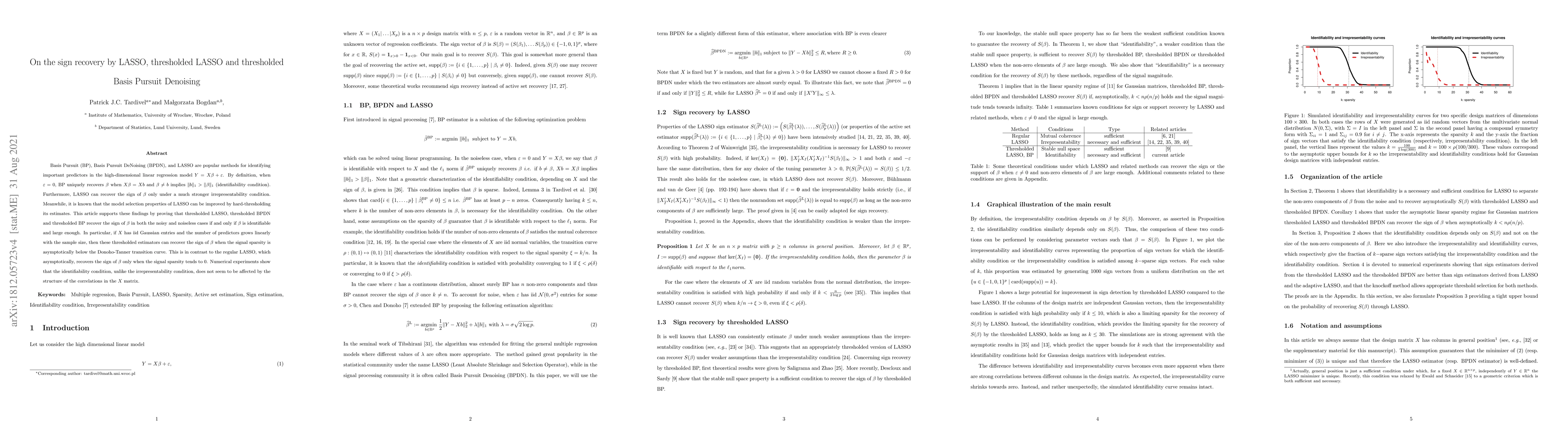 This paper investigates the sign recovery capabilities of LASSO, thresholded LASSO, and thresholded Basis Pursuit Denoising. It proves that these thresholded methods can recover the sign of regression coefficients under certain identifiability conditions, even when the signal sparsity is below the Donoho-Tanner transition curve, unlike regular LASSO.