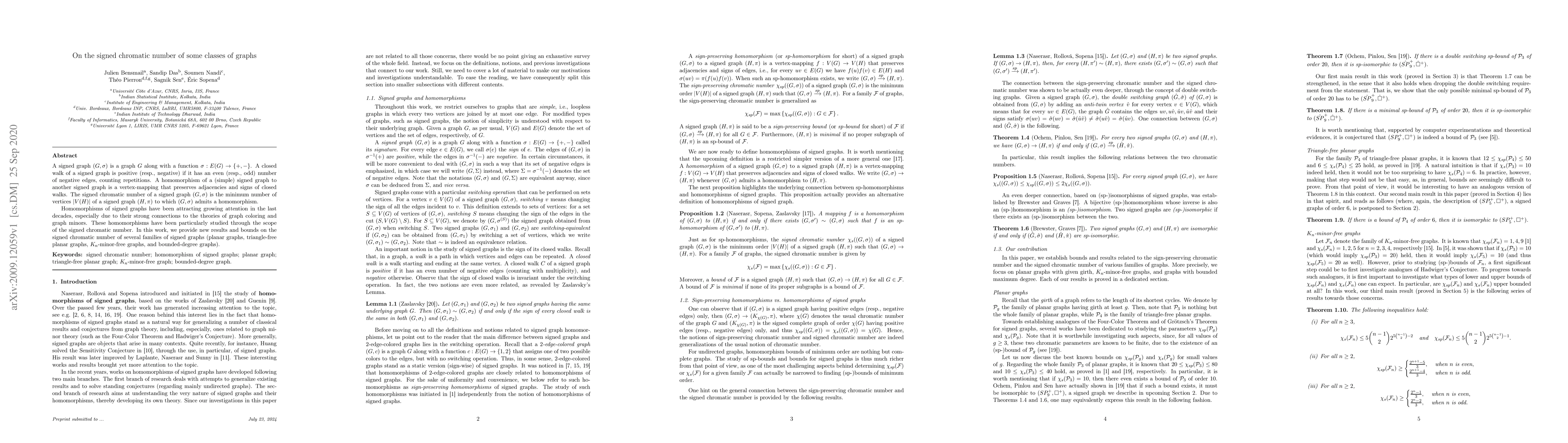 A signed graph $(G, \sigma)$ is a graph $G$ along with a function $\sigma: E(G) \to \{+,-\}$. A closed walk of a signed graph is positive (resp., negative) if it has an even (resp., odd) number of negative edges, counting repetitions. A homomorphism of a (simple) signed graph to another signed graph is a vertex-mapping that preserves adjacencies and signs of closed walks. The signed chromatic number of a signed graph $(G, \sigma)$ is the minimum number of vertices $|V(H)|$ of a signed graph $(H, \pi)$ to which $(G, \sigma)$ admits a homomorphism.Homomorphisms of signed graphs have been attracting growing attention in the last decades, especially due to their strong connections to the theories of graph coloring and graph minors. These homomorphisms have been particularly studied through the scope of the signed chromatic number. In this work, we provide new results and bounds on the signed chromatic number of several families of signed graphs (planar graphs, triangle-free planar graphs, $K_n$-minor-free graphs, and bounded-degree graphs).