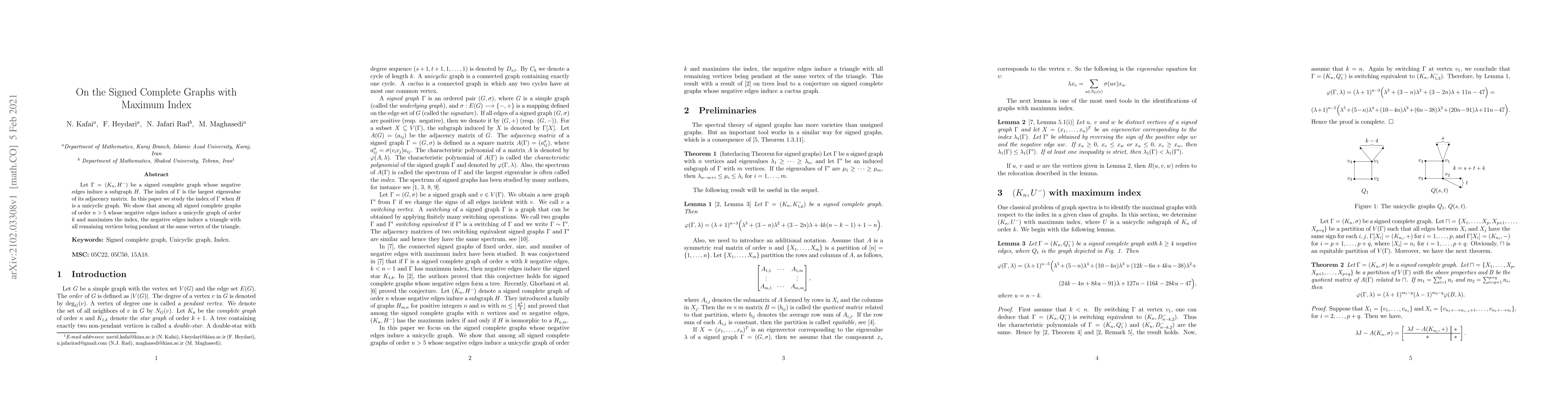 This paper investigates the maximum index in signed complete graphs where negative edges form a unicyclic subgraph, proving that the configuration maximizing the index is a triangle with all other vertices connected to one of its nodes.