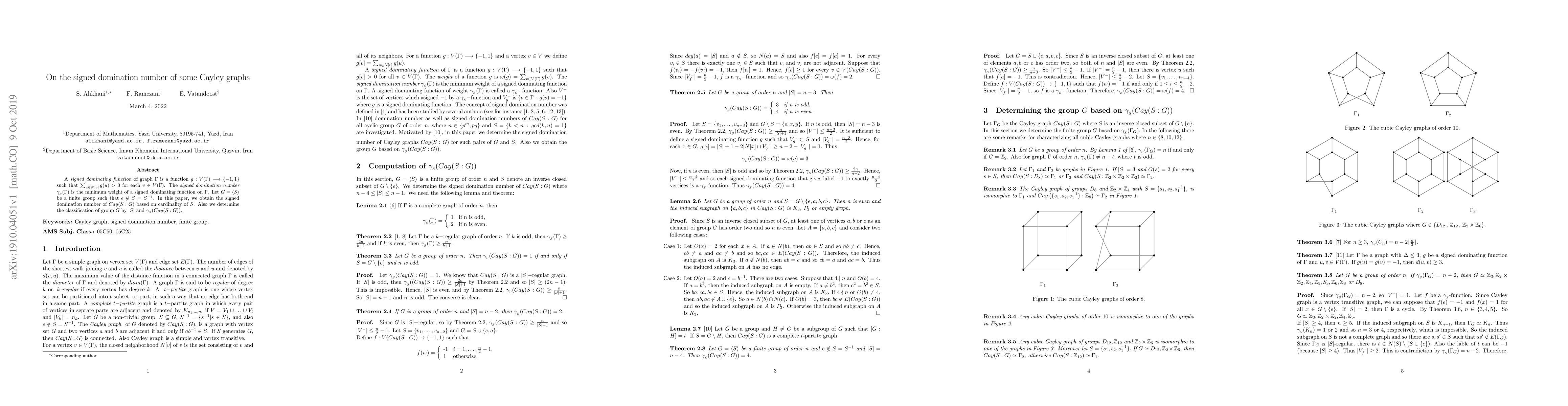 This paper determines the signed domination number of Cayley graphs based on group cardinality, providing a classification method for groups G and their Cayley graphs Cay(S:G).