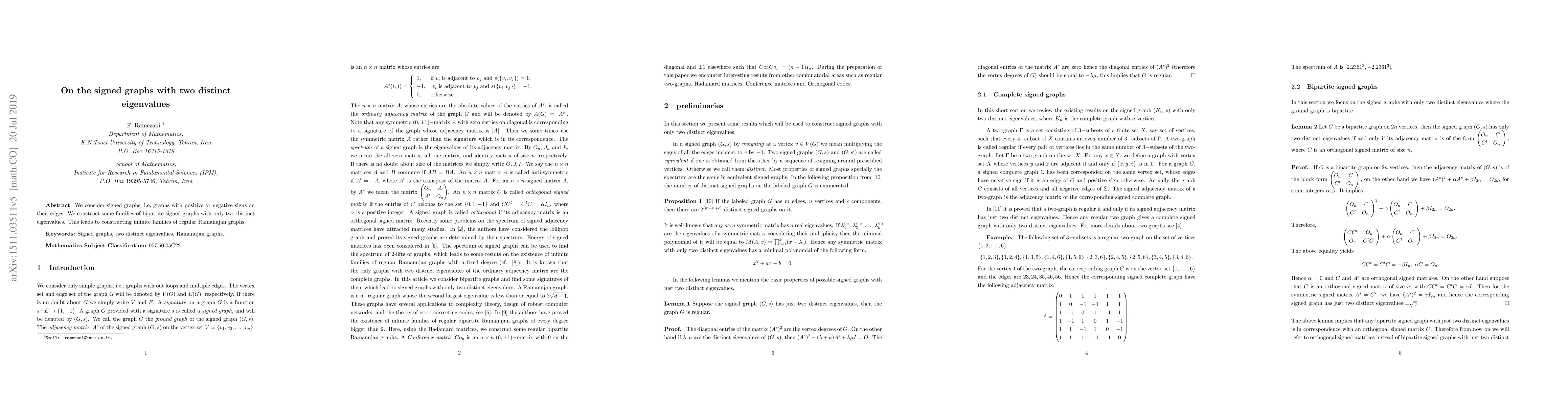 Summary: The paper explores signed graphs with exclusively two distinct eigenvalues, constructing families of bipartite signed graphs with this property and demonstrating the creation of infinite families of regular bipartite Ramanujan graphs.