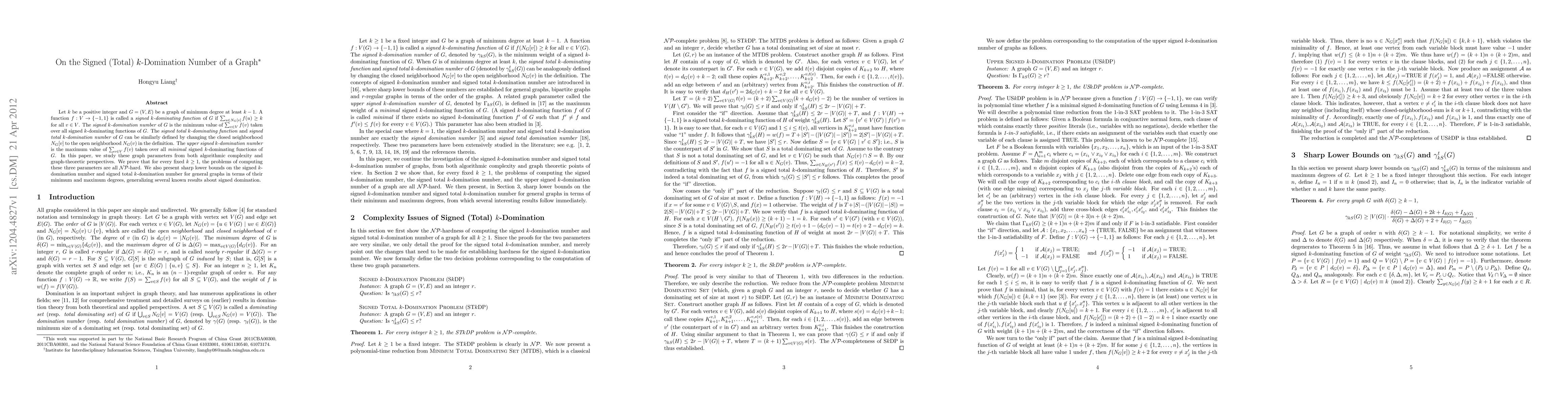The paper studies the signed (total) k-domination number of graphs from both algorithmic complexity and graph-theoretic perspectives, proving that computing these parameters is NP-hard for every fixed k ≥ 1.