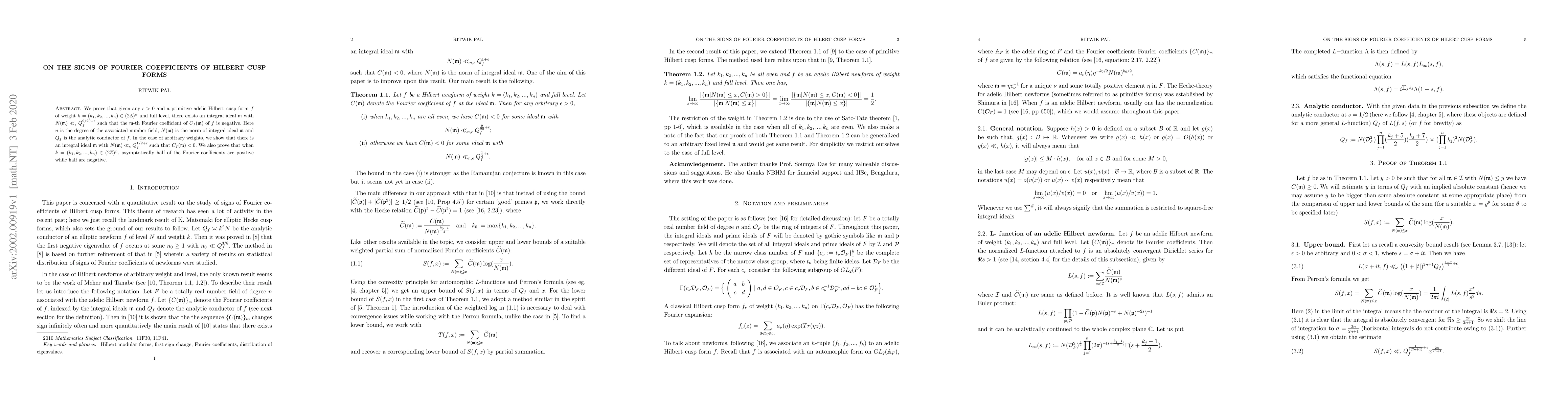 Researchers prove that for primitive Hilbert cusp forms, half of their Fourier coefficients are positive while half are negative, and they can find an ideal with a specific norm to make some coefficients negative.