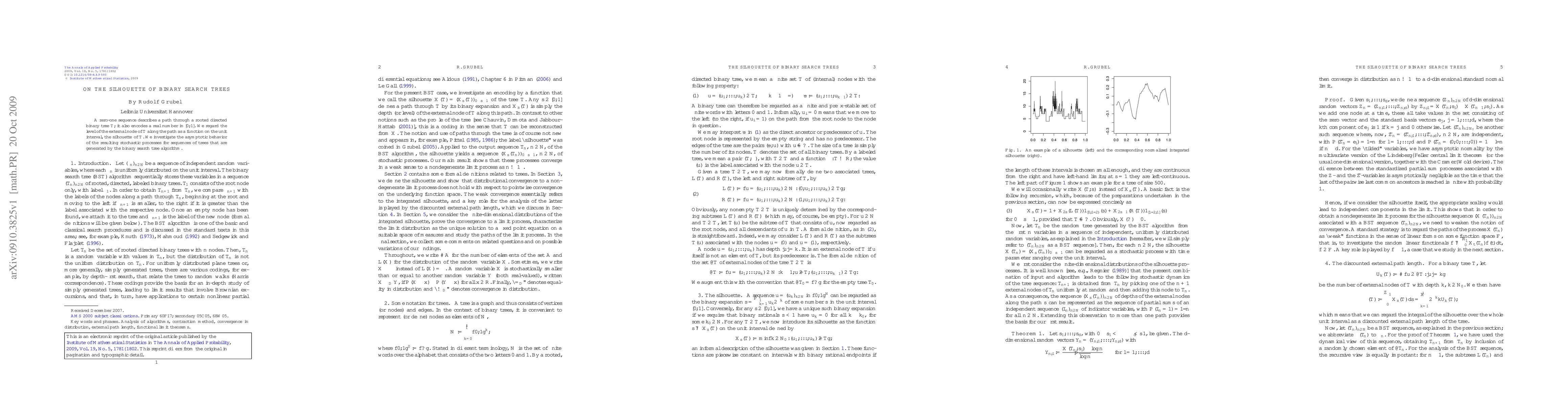 This paper explores the 'silhouette' of binary search trees, a function describing the level of the external node along a path in the tree, which encodes real numbers in the interval [0,1]. It investigates the asymptotic behavior of stochastic processes generated by sequences of trees produced by the binary search tree algorithm.