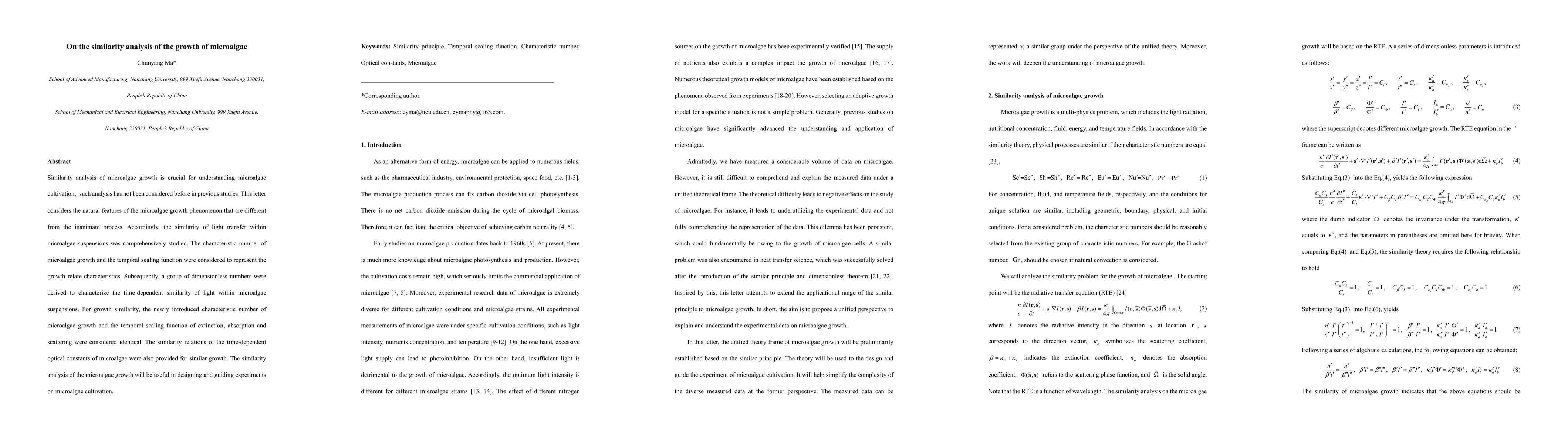 Researchers studied microalgae growth similarity using light transfer within suspensions, introducing new characteristic numbers to characterize time-dependent growth and optical constants. This analysis aims to guide experiments on microalgae cultivation.
