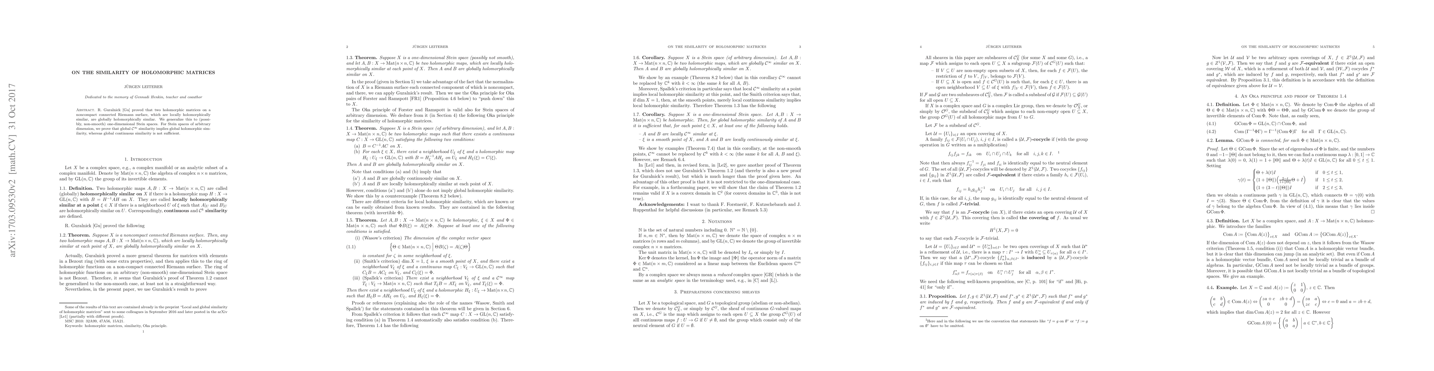 R. Guralnick (Linear Algebra Appl. 99, 85-96, 1988) proved that two holomorphic matrices on a noncompact connected Riemann surface, which are locally holomorphically similar, are globally holomorphically similar. We generalize this to (possibly, non-smooth) one-dimensional Stein spaces. For Stein spaces of arbitrary dimension, we prove that global $\mathcal C^\infty$ similarity implies global holomorphic similarity, whereas global continuous similarity is not sufficient.