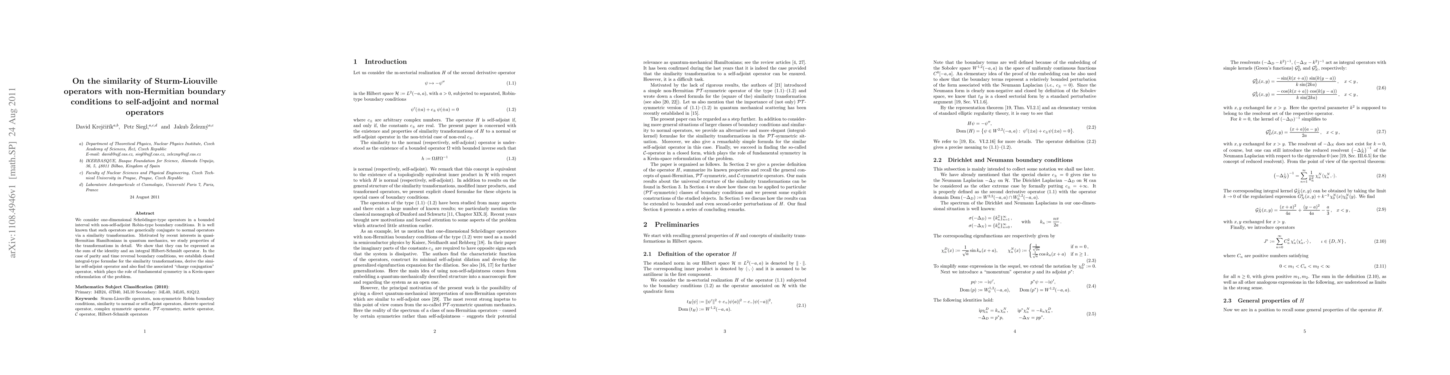 We consider one-dimensional Schroedinger-type operators in a bounded interval with non-self-adjoint Robin-type boundary conditions. It is well known that such operators are generically conjugate to normal operators via a similarity transformation. Motivated by recent interests in quasi-Hermitian Hamiltonians in quantum mechanics, we study properties of the transformations in detail. We show that they can be expressed as the sum of the identity and an integral Hilbert-Schmidt operator. In the case of parity and time reversal boundary conditions, we establish closed integral-type formulae for the similarity transformations, derive the similar self-adjoint operator and also find the associated "charge conjugation" operator, which plays the role of fundamental symmetry in a Krein-space reformulation of the problem.