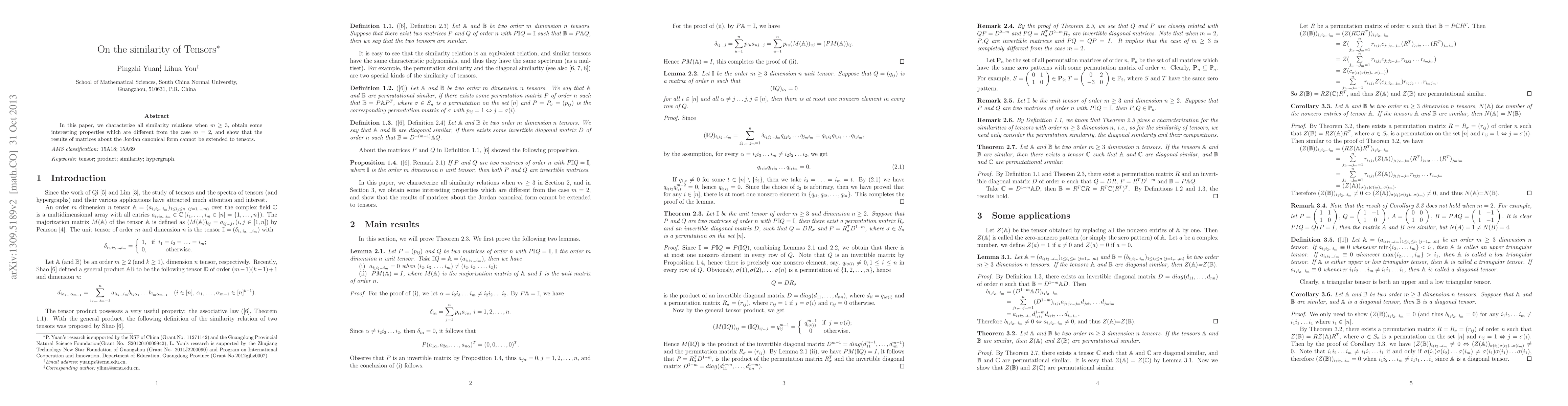 This paper proves that two matrices P and Q with a specific property are similar to each other if they have the same zero patterns with some permutation matrix, providing a characterization for tensor similarities.