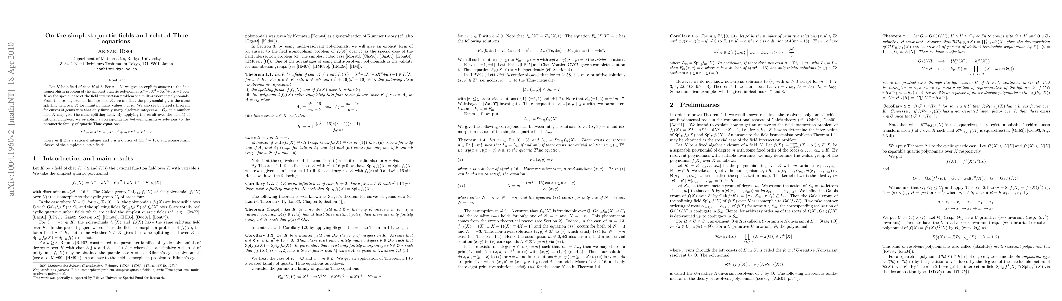 This paper investigates the field isomorphism problem for the quartic polynomial \(X^4 - aX^3 - 6X^2 + aX + 1\) over fields \(K\) of characteristic not equal to 2, revealing that the polynomial shares the same splitting field for infinitely many values of \(a\) over infinite fields \(K\). It also uses Siegel's theorem to show that only finitely many algebraic integers in a number field \(K\) yield the same splitting field, and establishes a correspondence between primitive solutions to a family of quartic Thue equations and isomorphism classes of simplest quartic fields.