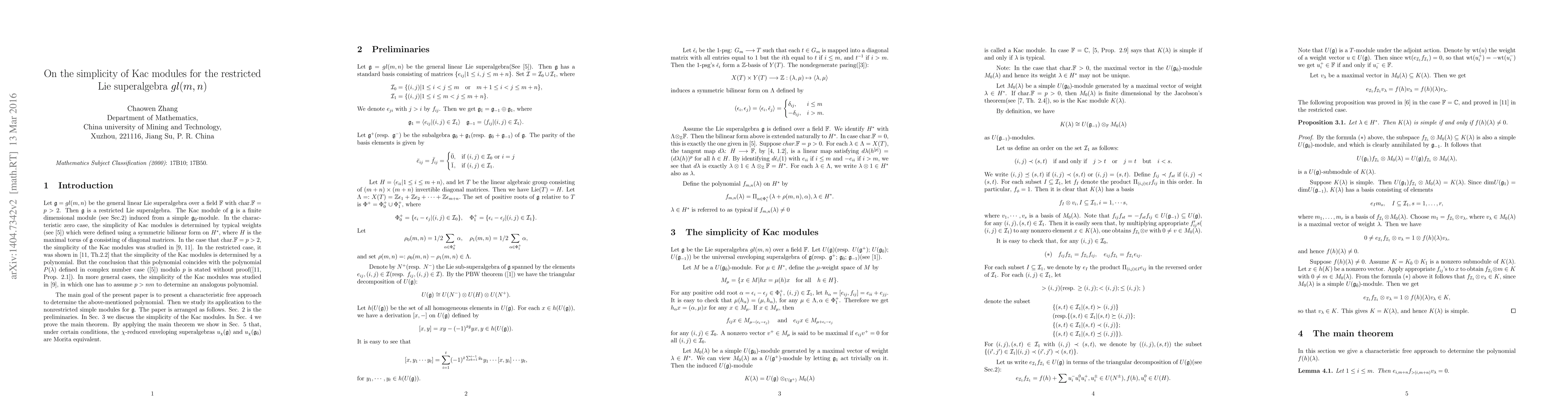 The polynomial which determine the simplicity of the Kac modules for the restricted Lie superalgebra gl(m,n) is completely determined by a characteristic free approach. Its application on the nonrestricted representation is investigated.