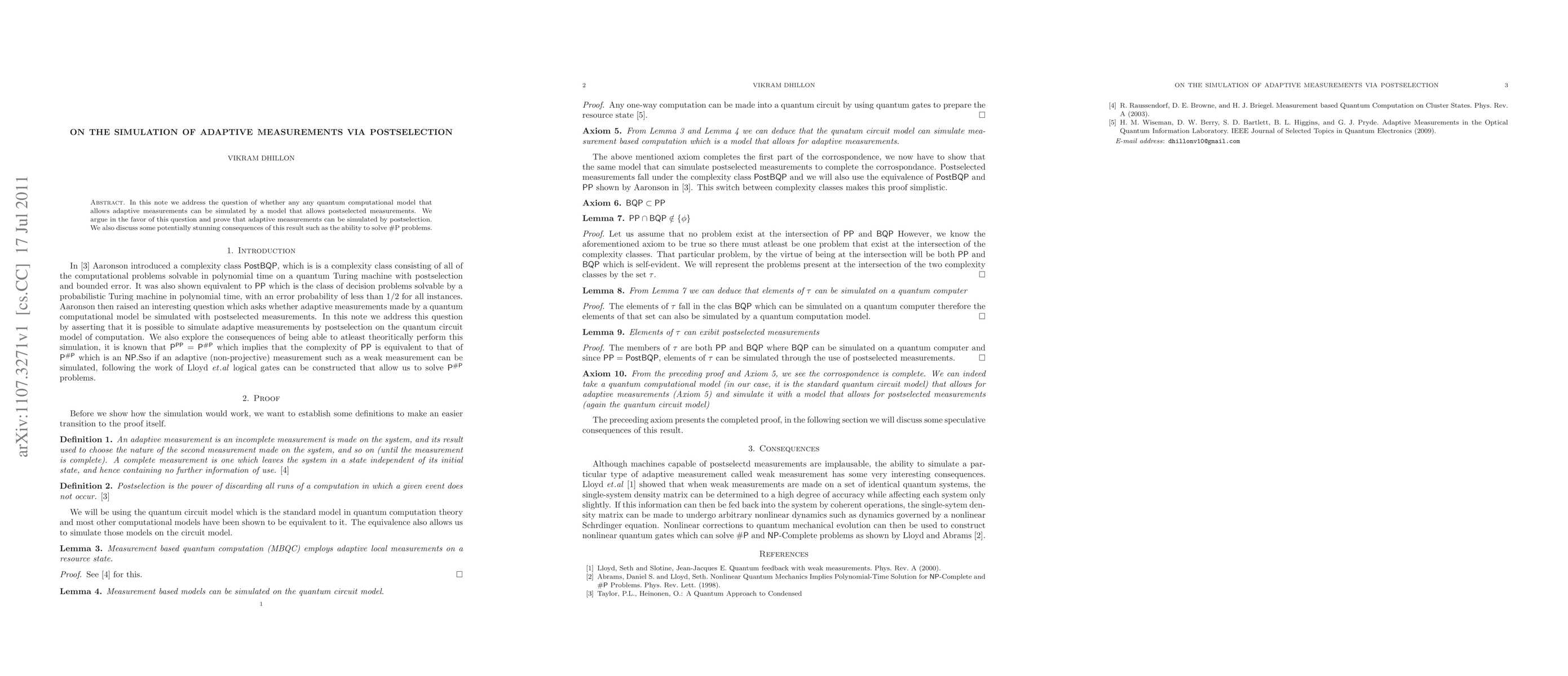 This paper demonstrates that quantum computational models permitting adaptive measurements can be simulated using postselected measurements, suggesting significant implications like the potential to solve #P problems. The authors provide a proof supporting their argument.