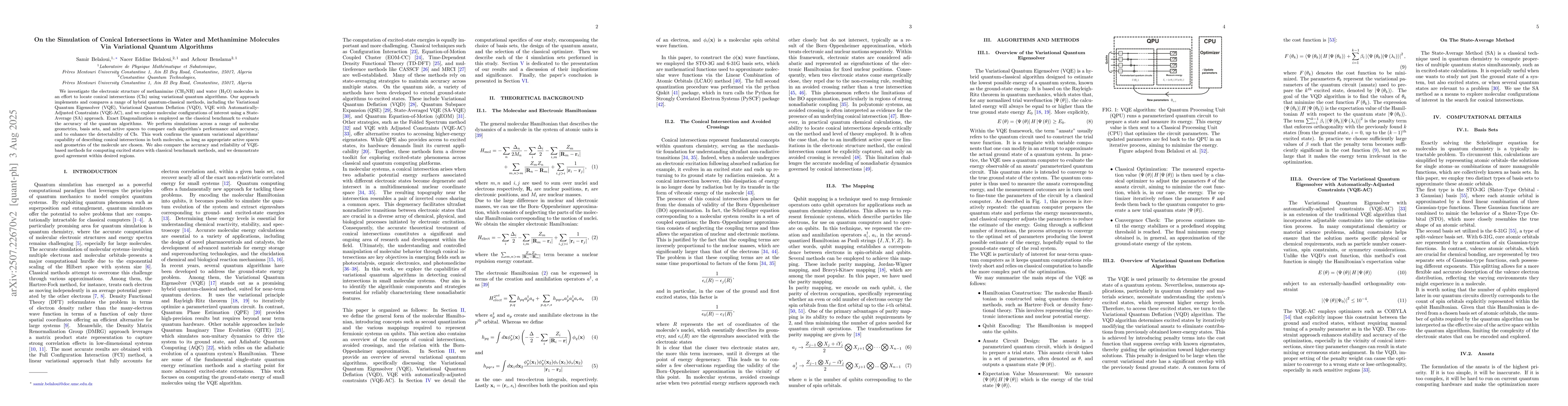 The paper presents an in-depth analysis of VQE, VQD, and VQE-AC algorithms for computing molecular energies, emphasizing their performance in identifying conical intersections in water and methanimine molecules.