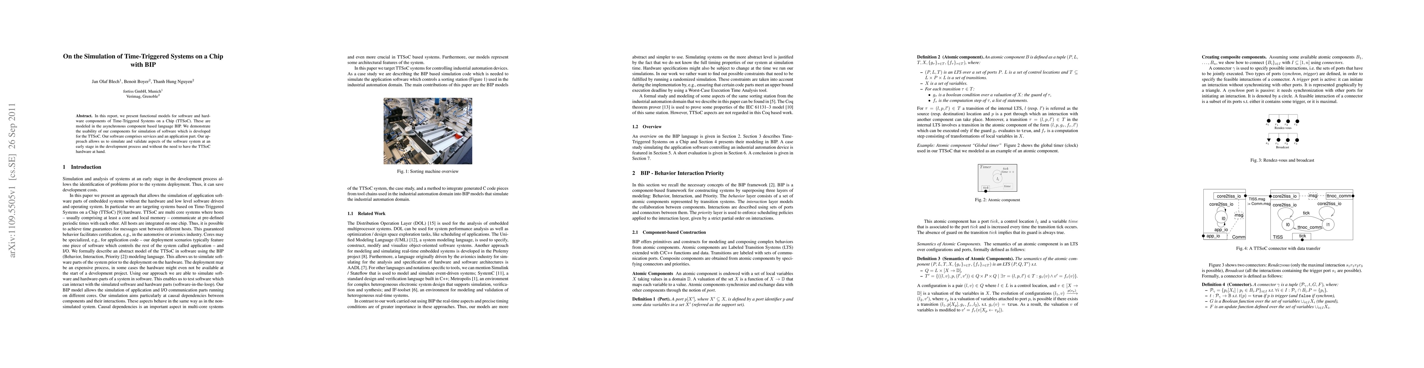 In this report, we present functional models for software and hardware components of Time-Triggered Systems on a Chip (TTSoC). These are modeled in the asynchronous component based language BIP. We demonstrate the usability of our components for simulation of software which is developed for the TTSoC. Our software comprises services and an application part. Our approach allows us to simulate and validate aspects of the software system at an early stage in the development process and without the need to have the TTSoC hardware at hand.