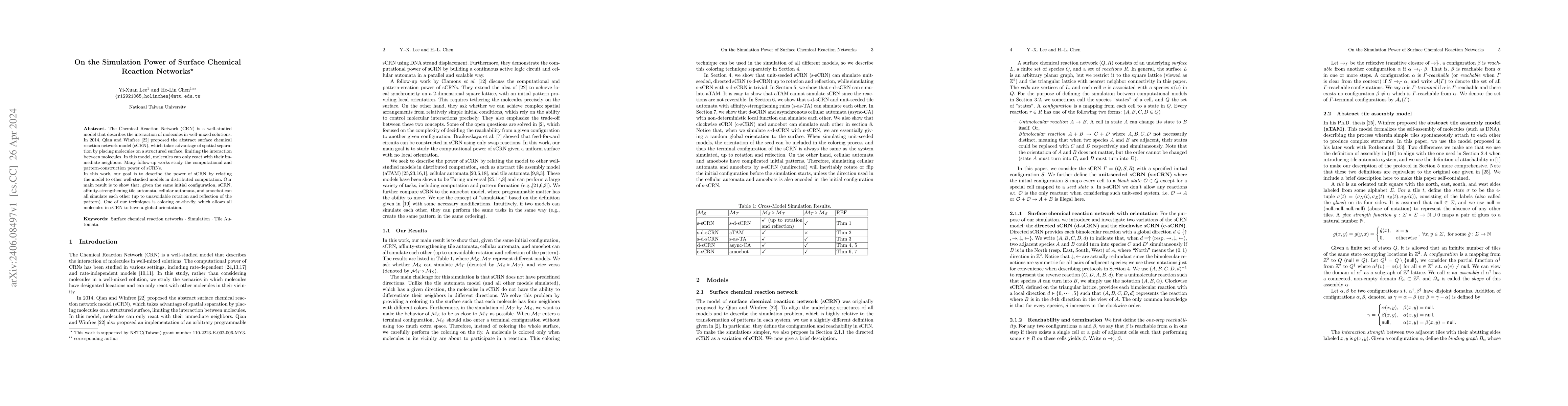 The Chemical Reaction Network (CRN) is a well-studied model that describes the interaction of molecules in well-mixed solutions. In 2014, Qian and Winfree [22] proposed the abstract surface chemical reaction network model (sCRN), which takes the advantage of spatial separation by placing molecules on a structured surface, limiting the interaction between molecules. In this model, molecules can only react with their immediate neighbors. Many follow up works study the computational and pattern-construction power of sCRNs. In this work, our goal is to describe the power of sCRN by relating the model to other well-studied models in distributed computation. In this work, our main result is to show that, given the same initial configuration, sCRN, affinity strengthening tile automata, cellular automata, and amoebot can all simulate each other (up to unavoidable rotation and reflection of the pattern). One of our techniques is a coloring on-the-fly, which allows all molecules in sCRN to have a global orientation.