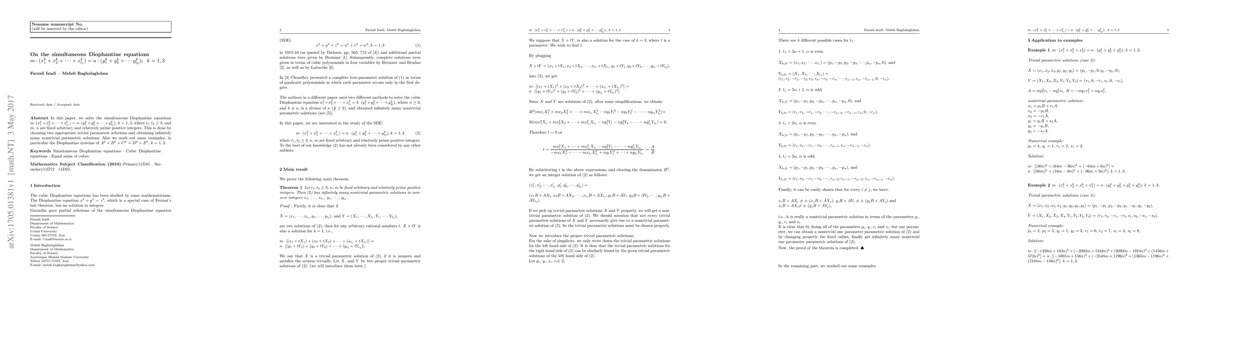 In this paper, we solve the simultaneous Diophantine equations m.(x_1^k+....+x_{t_1}^k)=n.(y_1^k+....+y_{t_2}^k); k=1,3, where t_1, t_2>3, and m, n are fixed arbitrary and relatively prime positive integers. This is done by choosing two appropriate trivial parametric solutions and obtaining infinitely many nontrivial parametric solutions. Also we work out some examples, in particular the Diophantine systems of A^k+B^k+C^k=D^k+E^4; k=1,3.