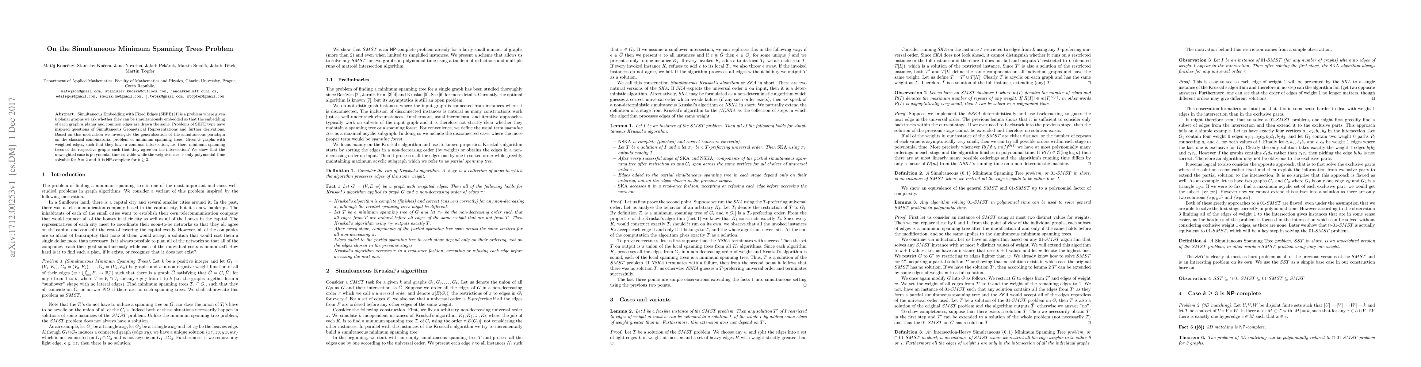 This paper investigates the generalization of simultaneous embedding problems to minimum spanning trees, focusing on whether $k$ graphs with common edges can have their minimum spanning trees simultaneously constructed such that they agree on shared edges. The unweighted case is polynomial-time solvable, while the weighted case is only tractable for $k=2$ and becomes NP-complete for $k\geq 3$.
