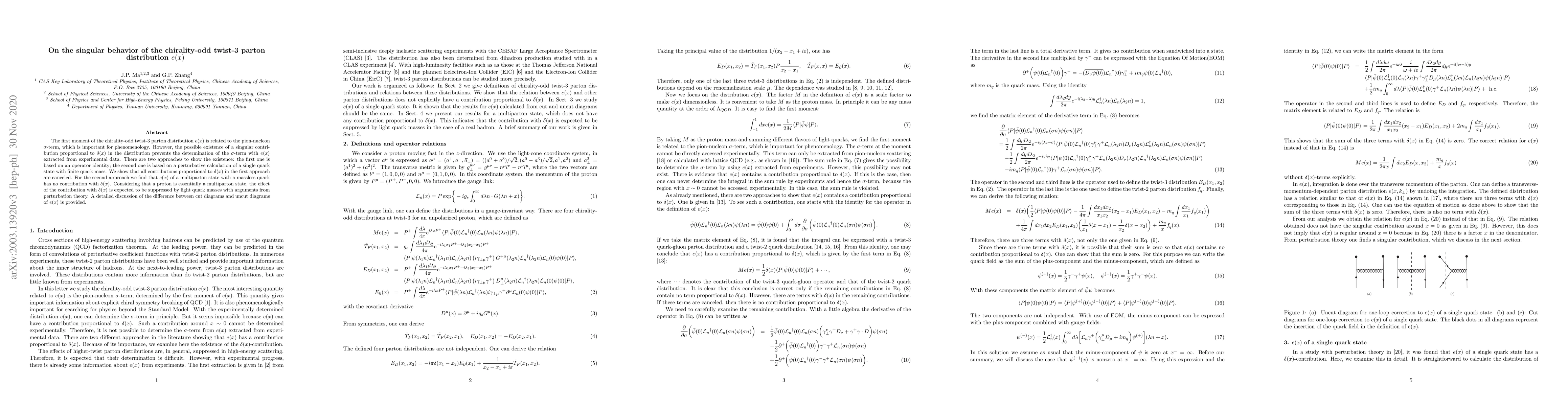 Researchers investigated the chirality-odd twist-3 parton distribution e(x) to determine its relation to the pion-nucleon sigma-term, finding no singular contribution proportional to delta(x), which suggests that the effect of this contribution is expected to be suppressed by light quark masses.