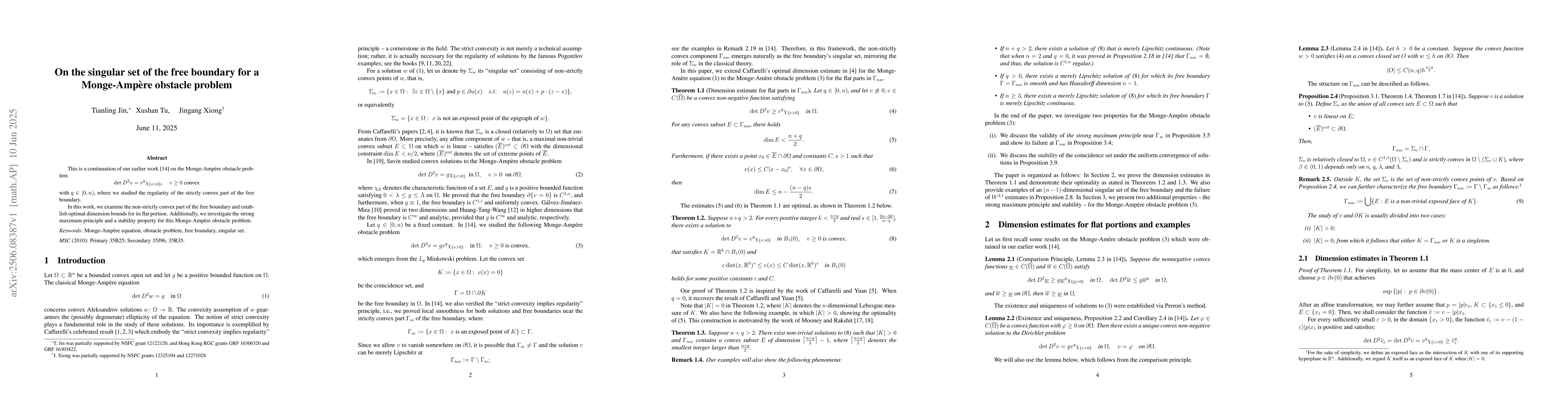 This is a continuation of our earlier work [14] on the Monge-Amp\`ere obstacle problem \[ \det D^2 v = v^q \chi_{\{v>0\}}, \quad v \geq 0 \text{ convex} \] with $q \in [0,n)$, where we studied the regularity of the strictly convex part of the free boundary. In this work, we examine the non-strictly convex part of the free boundary and establish optimal dimension bounds for its flat portion. Additionally, we investigate the strong maximum principle and a stability property for this Monge-Amp\`ere obstacle problem.
