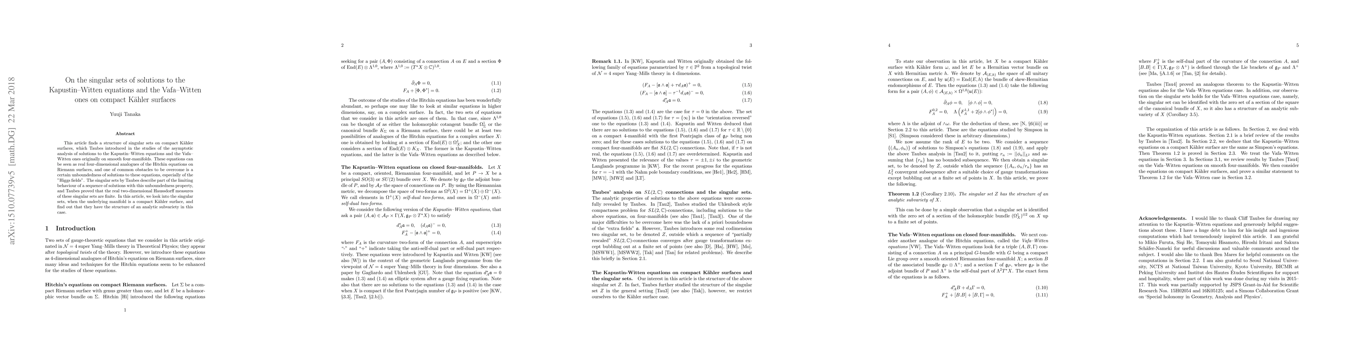 This article finds a structure of singular sets on compact Kahler surfaces, which Taubes introduced in the studies of the asymptotic analysis of solutions to the Kapustin-Witten equations and the Vafa-Witten ones originally on smooth four-manifolds. These equations can be seen as real four-dimensional analogues of the Hitchin equations on Riemann surfaces, and one of common obstacles to be overcome is a certain unboundedness of solutions to these equations, especially of the "Higgs fields". The singular sets by Taubes describe part of the limiting behaviour of a sequence of solutions with this unboundedness property, and Taubes proved that the real two-dimensional Haussdorff measures of these singular sets are finite. In this article, we look into the singular sets, when the underlying manifold is a compact Kahler surface, and find out that they have the structure of an analytic subvariety in this case.