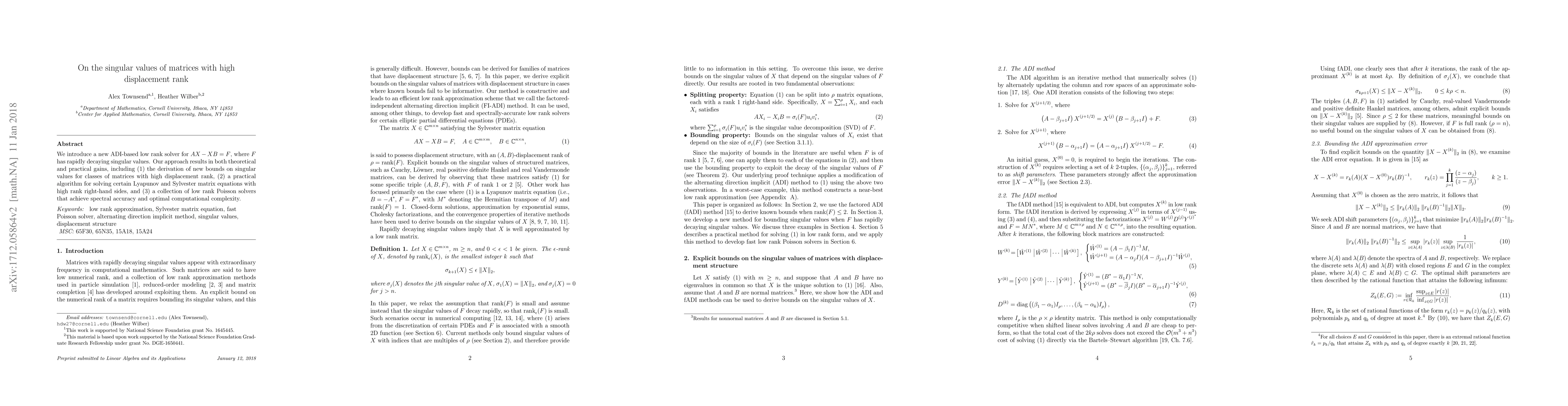 We introduce a new ADI-based low rank solver for $AX-XB=F$, where $F$ has rapidly decaying singular values. Our approach results in both theoretical and practical gains, including (1) the derivation of new bounds on singular values for classes of matrices with high displacement rank, (2) a practical algorithm for solving certain Lyapunov and Sylvester matrix equations with high rank right-hand sides, and (3) a collection of low rank Poisson solvers that achieve spectral accuracy and optimal computational complexity.