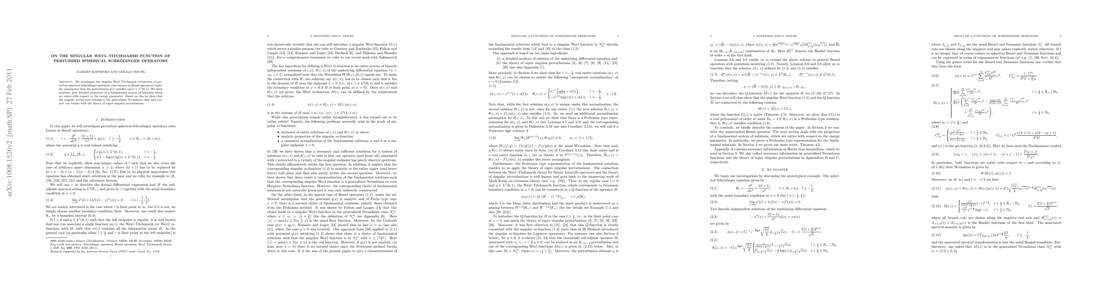 We investigate the singular Weyl-Titchmarsh m-function of perturbed spherical Schroedinger operators (also known as Bessel operators) under the assumption that the perturbation $q(x)$ satisfies $x q(x) \in L^1(0,1)$. We show existence plus detailed properties of a fundamental system of solutions which are entire with respect to the energy parameter. Based on this we show that the singular m-function belongs to the generalized Nevanlinna class and connect our results with the theory of super singular perturbations.