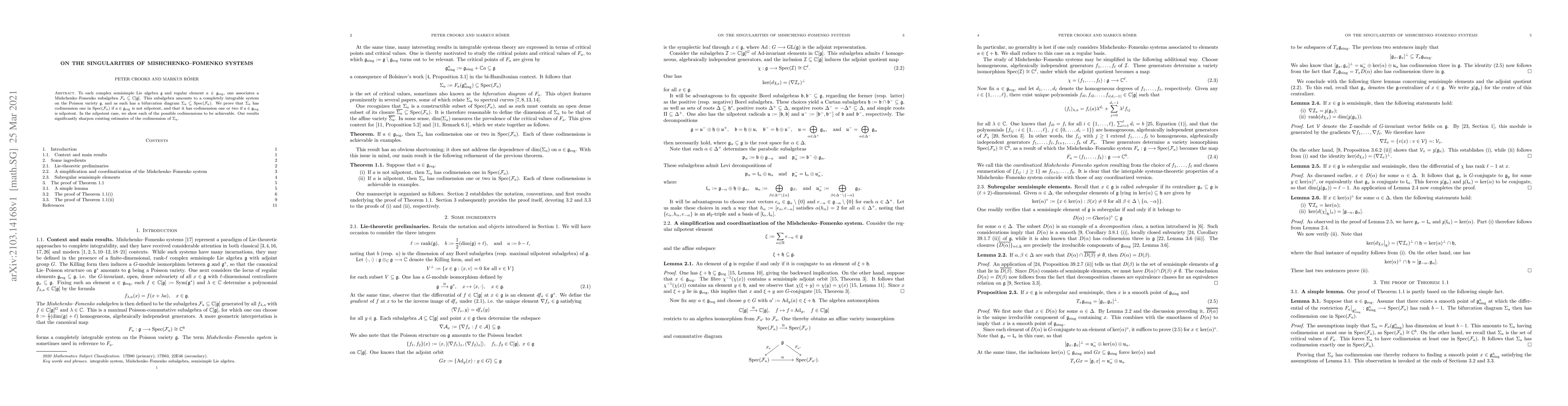 This paper investigates the singularities of Mishchenko-Fomenko systems associated with regular elements of complex semisimple Lie algebras, proving that the bifurcation diagram has codimension one unless the element is nilpotent, in which case codimension one or two is possible, with both cases demonstrated.